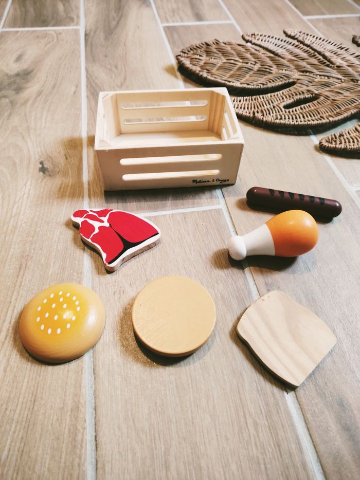 🍗Dinette en bois cagette avec divers aliments hamburger poulet.. marque Melissa et Doug JB680