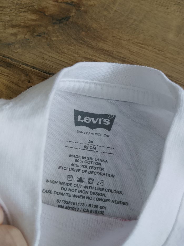 T-shirt blanc et rouge manches courtes garçon, 2 ans de chez Levi's. Authentique. En très bon état, sans tâche ni trou. Quelques petites bouloches dues aux lavages. Maison non fumeur mais avec animaux.
