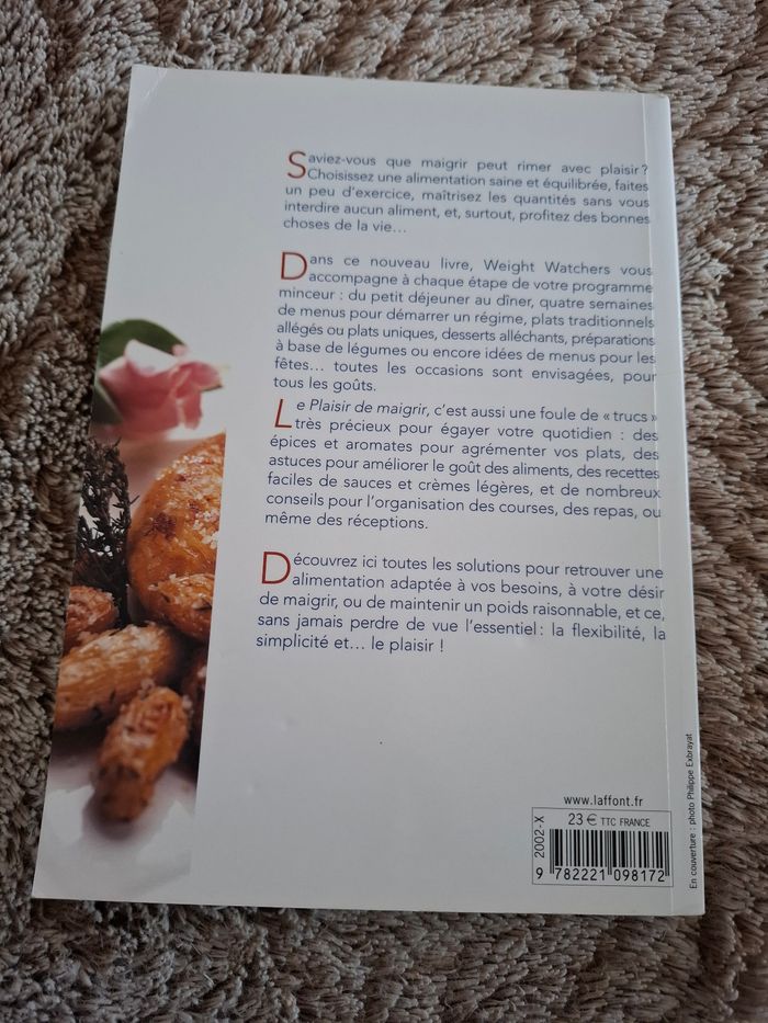 Livre WeightWhatchers Le plaisir de maigrir en très bon état Éditions Robert Laffont Perdre du poids sans renoncer au plaisir de manger : tel est le secret de la réussite du programme Weight Watchers. C'est le fil conducteur de cet ouvrage, qui vous accompagne à chaque étape avec : - 179 recettes de plats adaptés à toutes les occasions : recettes basiques, très légères, plats uniques, préparations à base de légumes, repas d'exception (menu d'anniversaire, du Nouvel An ou entre amis) et les recettes "incontournables" qui ont fait le succès de ce régime ; - des menus pour 4 semaines de repas « à 18 POINTS » ; - des astuces, tours de main et conseils pour organiser les repas, agrémenter les plats, réaliser crèmes et sauces légères, etc. Prix d'achat 23 euros