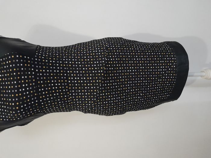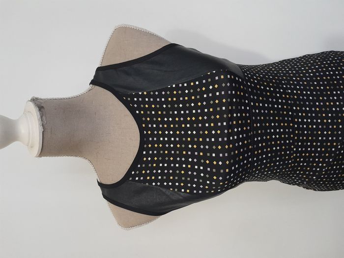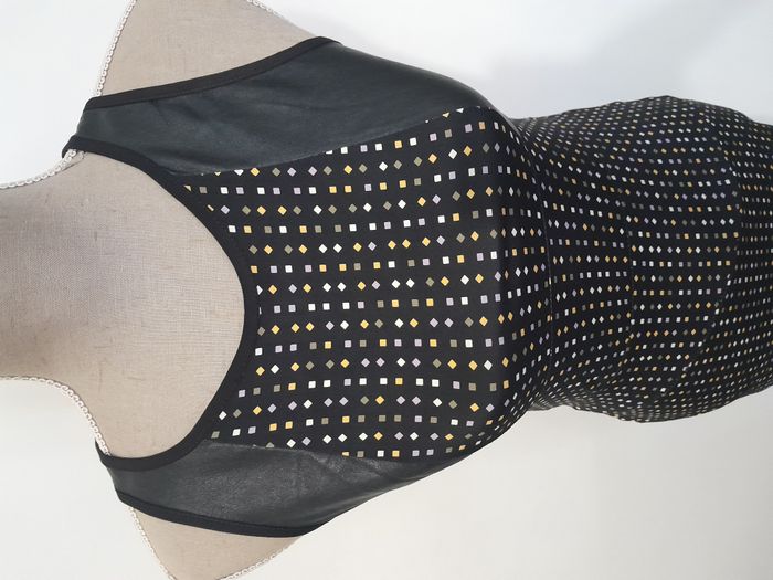Robe de soirée, imprimé petit carreaux multicolore, dos nageur, empiècement en cuir en haut, sur les côté et le bas, attache fermeture éclair au dos Longueur : 80cm, Fermeture éclair : 45cm Aiss / Aiss : 43cm Matière : 66 % Polyester, 30 % Cuir, 4 % Elasthanne Marque : Purple Jam