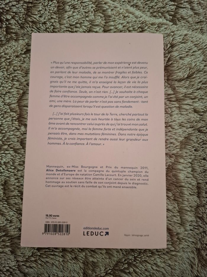 Témoignage Guérie par ton amour de Alice Detollenaere en très bon état Éditions Leduc "Plus qu’une responsabilité, parler de mon expérience est devenu un devoir, afin que d’autres se prémunissent et n’aient plus peur, en parlant de leur maladie, de se montrer fragiles et faibles. Ce courage, c’est mon homme qui me l’a insufflé. Alors que je craignais qu’il ne me quitte, il m’a enseigné la leçon de vie la plus importante que j’aie jamais reçue. Pour avancer, il est nécessaire de faire confiance. Seule, on n’est rien. Je souhaite à chaque femme d’être accompagnée comme je l’ai été par un conjoint, un ami, une mère. La peur de parler n’est pas sans fondement : tant de gens disparaissent lorsqu’il est question de maladie. J’ai fait plusieurs fois le tour de la Terre, cherché partout la personne que j’étais, je me suis heurtée à tous les coins de mon âme avant de rencontrer celui auprès de qui j’ai trouvé mon salut. Il m’a accompagnée, moi la femme forte et indépendante que je pensais être, dans mes mutations féminines. Dans notre époque féministe, je crois important de rendre aussi leur grandeur aux hommes. À la confiance. À l’amour." Ce récit est une belle leçon de vie, de résilience, lourd en émotions.. Prix d'achat 19.90 euros