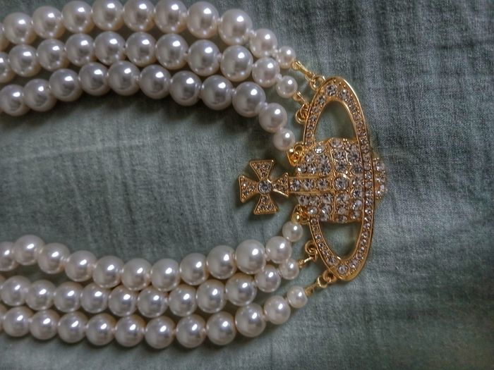 Collier Vivienne Westwood à Perles Modèle Orb Ce collier doré se compose de 3 rangées de perles blanches, offrant un rendu sophistiqué et reconnaissable. Il est rehaussé d’un large pendentif Orb serti de cristaux brillants, signature emblématique de la marque ✨ Le système de fermeture est un fermoir décoratif agrémenté du logo. Longueur totale : environ 40 cm •Taille du pendentif : environ 3,5 cm x 2,5 cm