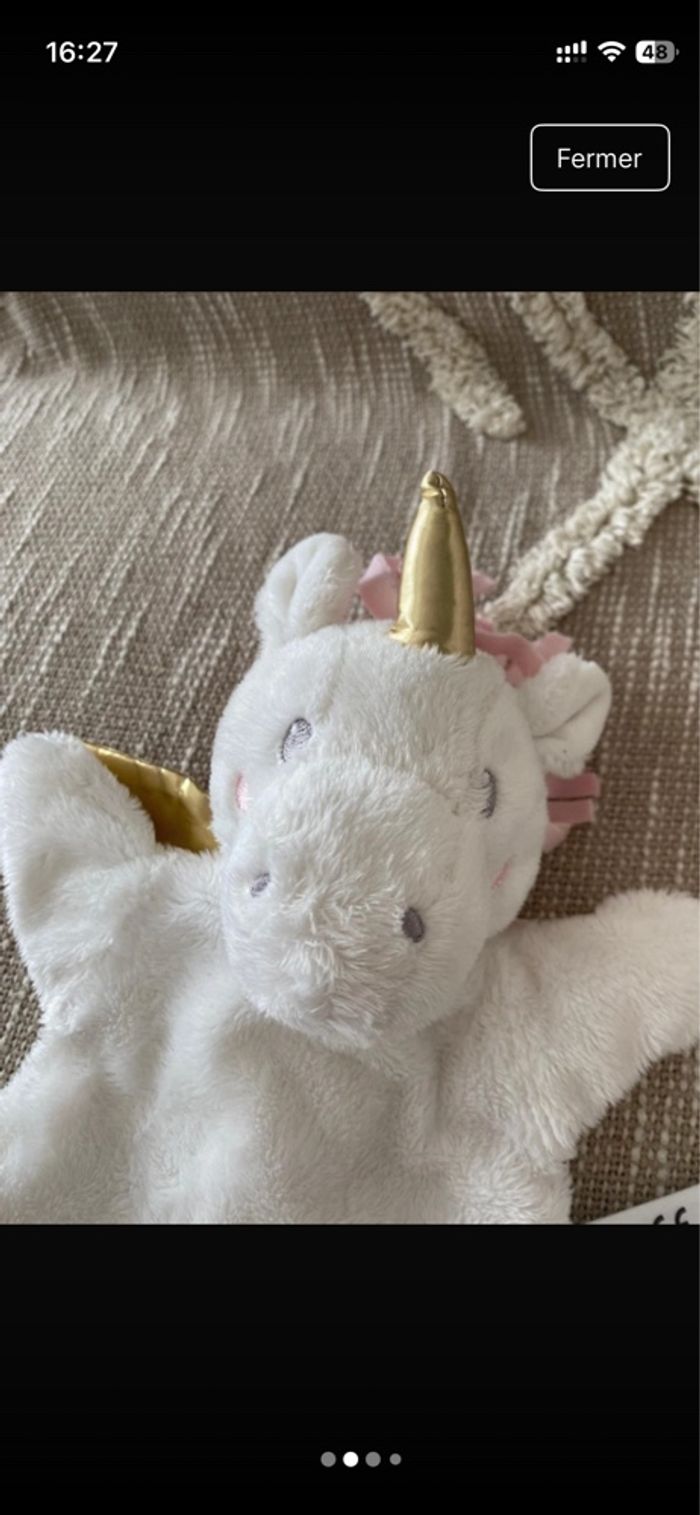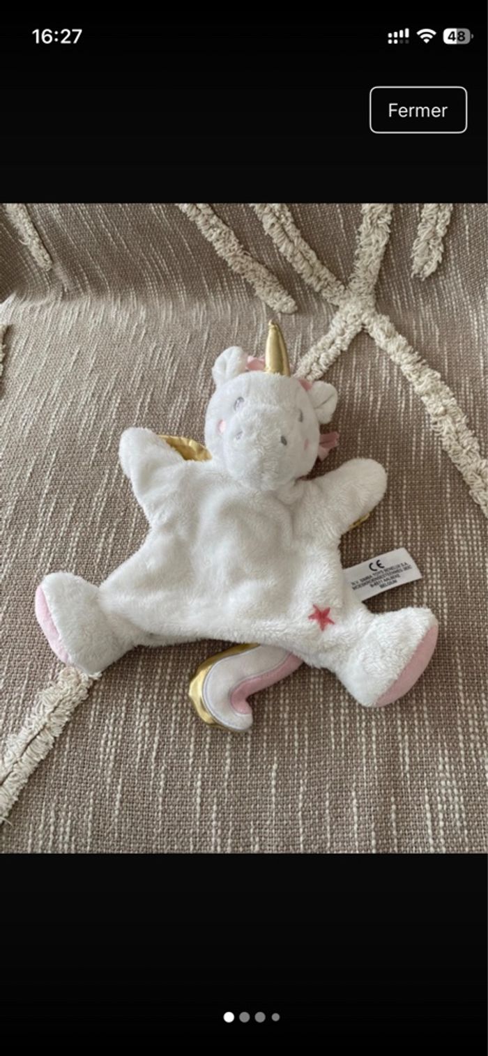 Peluche doudou marionnette Simba toys  licorne blanc rose et doré parfait état - photo numéro 3