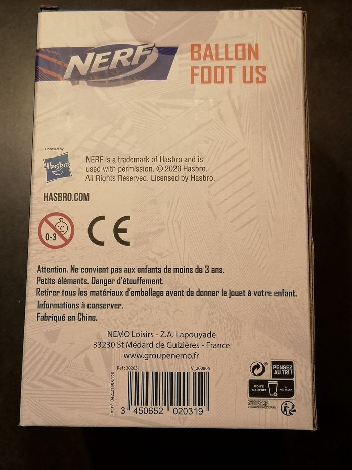 Ballon Nerf, idéal pour jouer au rugby. Ballon en mousse, couleur orange et blanc Idéal pour jouer sur la plage, à la piscine,... Idéal pour les enfants comme pour les adultes Neuf dans son emballage d'origine - Type de produit : Ballon de rugby / ballon de football US - Marque : Nerf / Hasbro - Matière : Mousse - Dimensions : 22 cm État neuf, jamais utilisé. N'hésitez pas à me contacter pour plus d'informations.