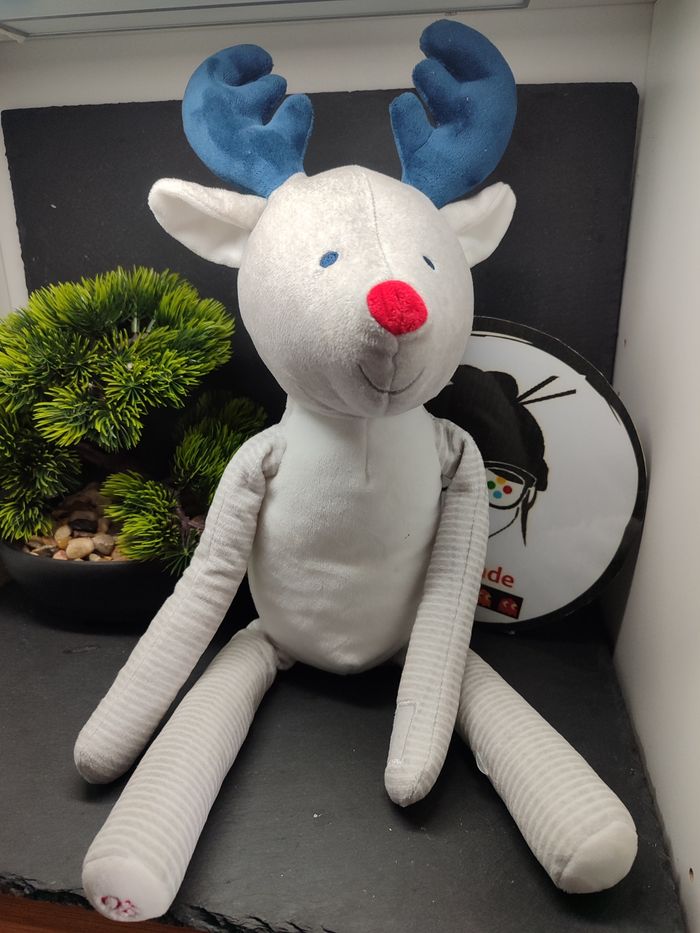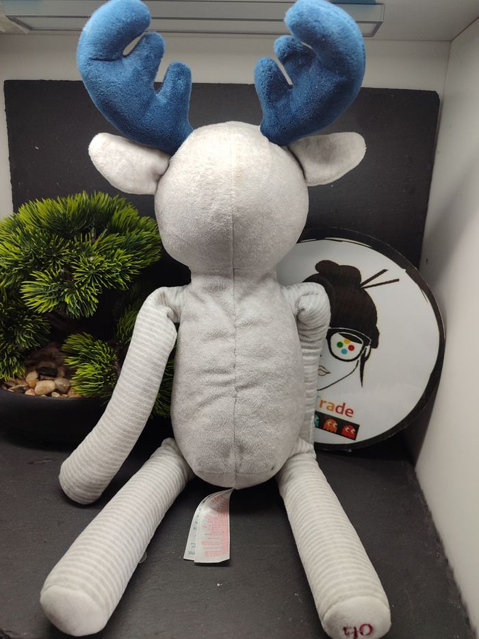 doudou peluche cerf renne obaibi okaidi gris blanc bleu rouge rayé pantin