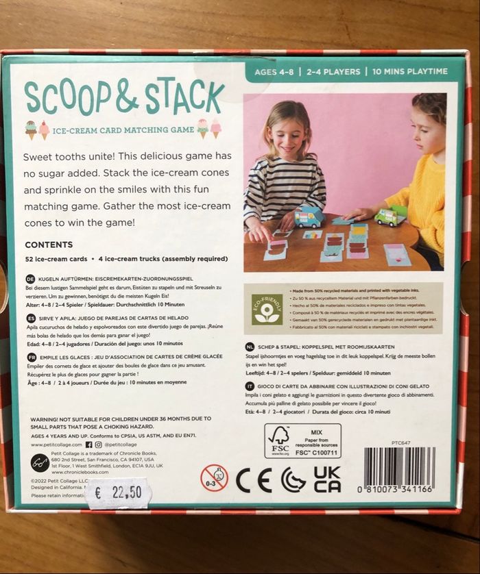 Jeu de cartes de la marque californienne Petit Collage. Rassemblez-vous en famille et plongez dans une compétition amicale pour voir qui pourra empiler le plus de boules de glace sur son cornet ! Dans ce jeu, chaque joueur tentera de collecter et d'empiler le maximum de boules de glace pour créer le plus grand et le plus impressionnant des cornets. A partir de 4 ans. Petit Collage est une marque engagée qui combine une esthétique moderne avec un critère de durabilité (carton recyclé, encres végétales, bois FSC, etc.) Prix public : 22,50 €. Article neuf. Envoi rapide et soigné ! De nombreux autres produits de la marque sont disponibles dans mon dressing !