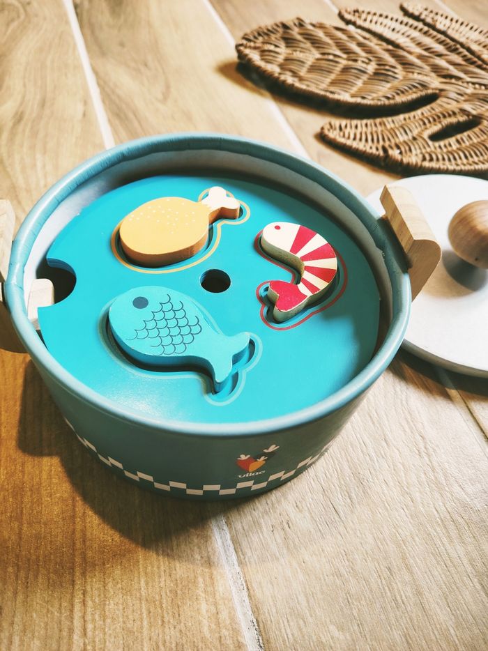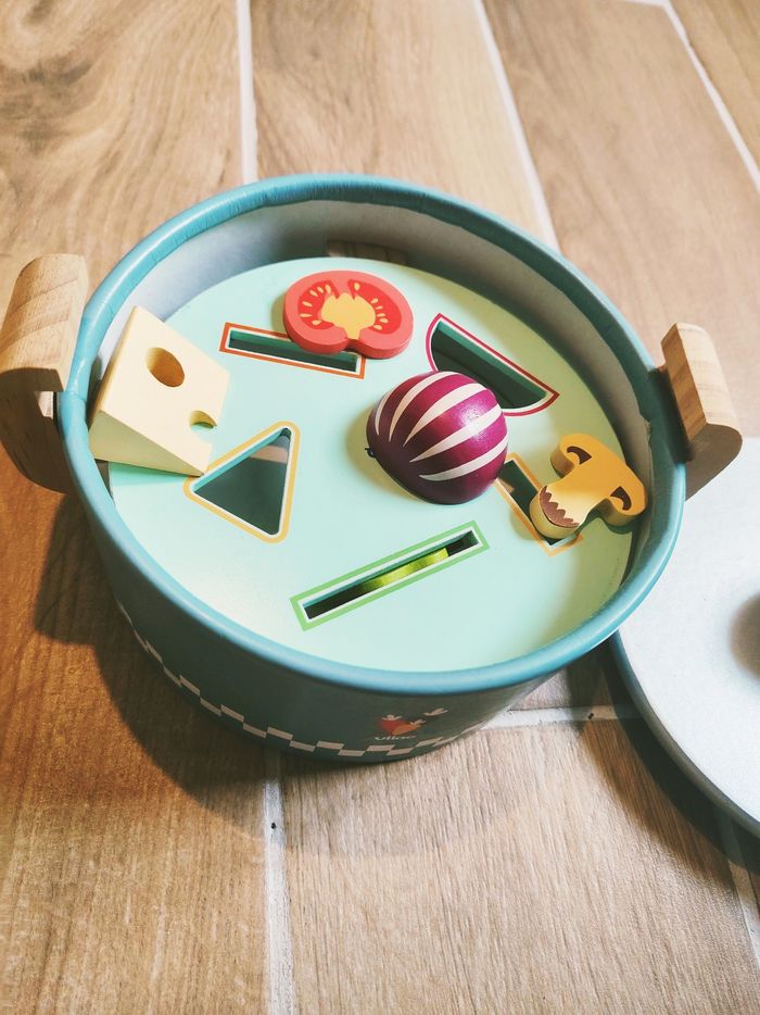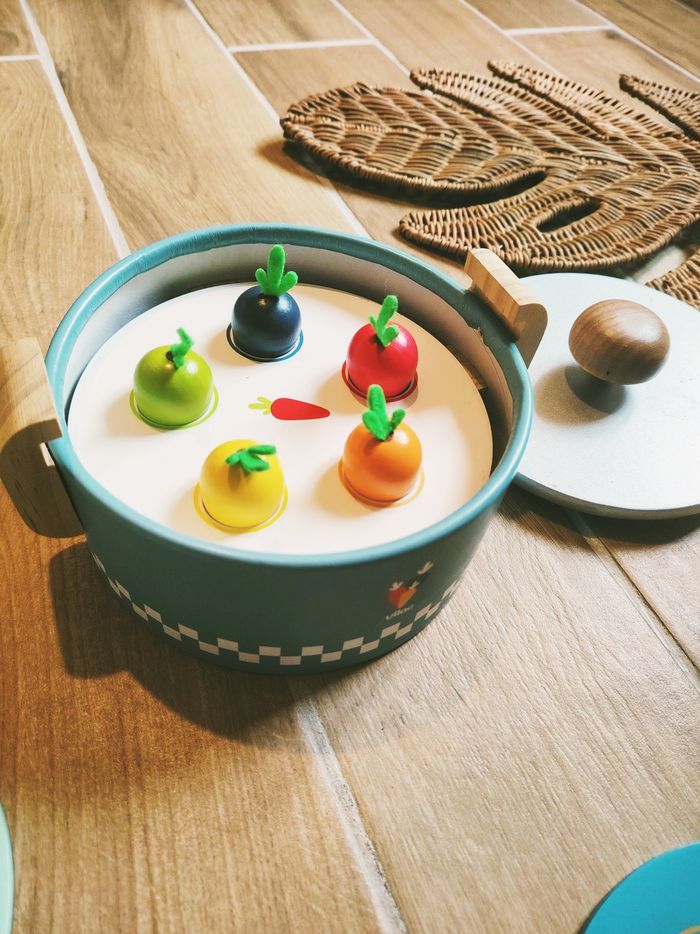 🍲Jeu d'éveil 3 en 1 - Popotte Minus avec aliments en bois marque Vilac JB1408