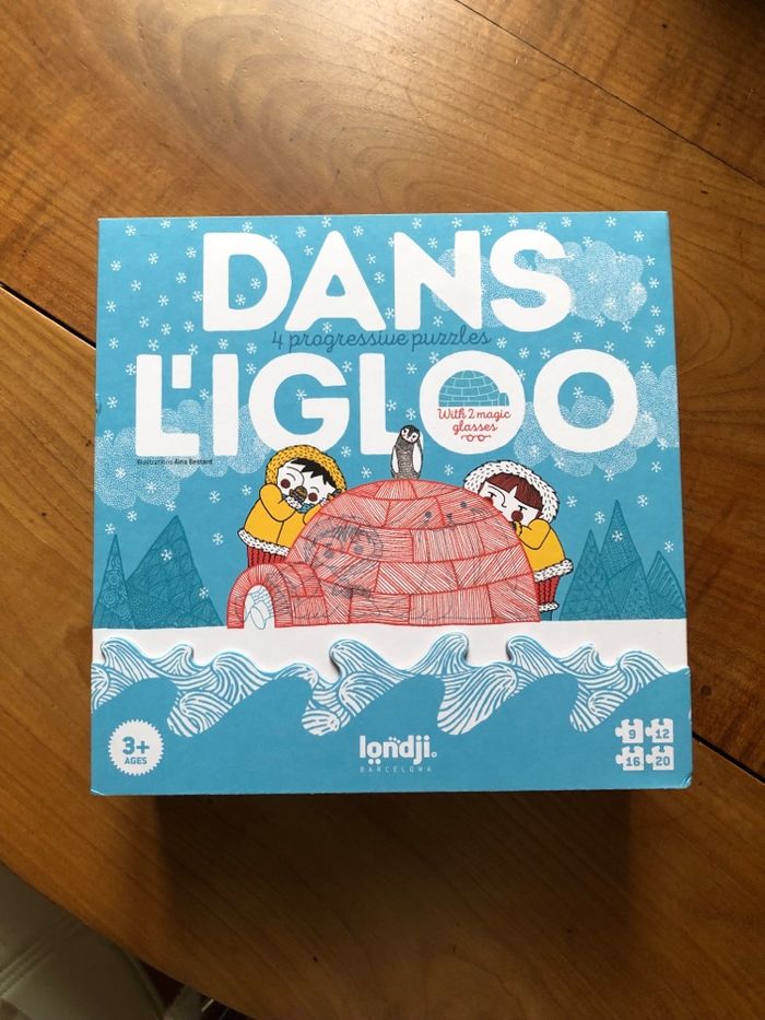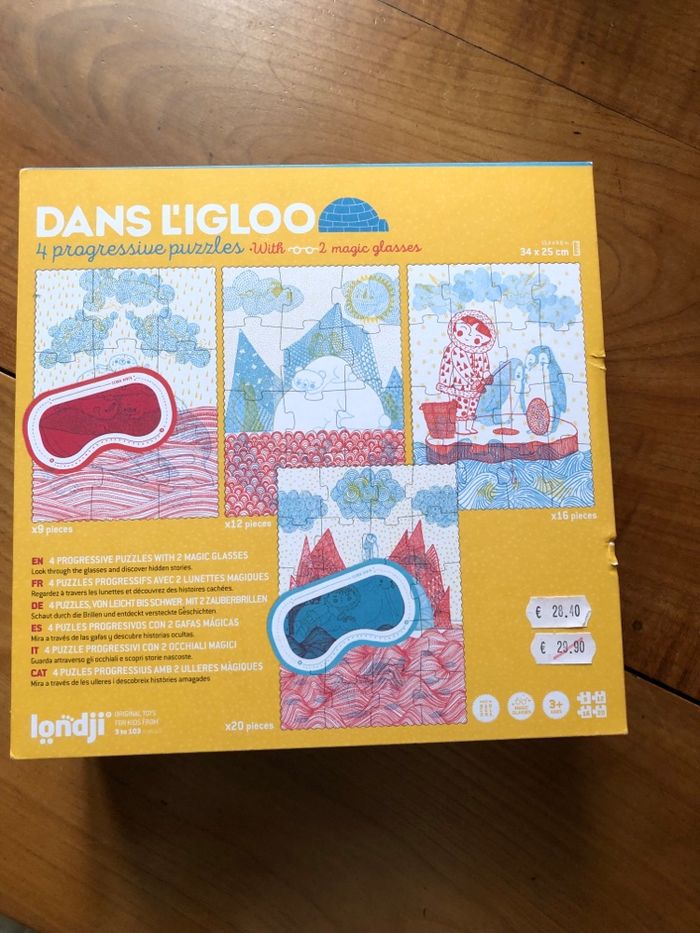 Jeu Londji Dans l Igloo NEUF avec etiquette. 4 puzzles progressifs avec 2 lunettes magiques pour decouvrir les images cachees sous la glace. 57 pieces. Age 3 a 6 ans. Article neuf, seul defaut : boite legerement abimee sur le cote, contenu impeccable et jamais utilise. Prix public etiquette 30 euros, je le vends 17 euros a cause de la boite. Londji est une marque reconnue pour ses puzzles magnifiquement illustres et de grande qualite, fabriques en Europe. Envoi soigne et rapide. Remise possible si achat de plusieurs articles sur mon profil.