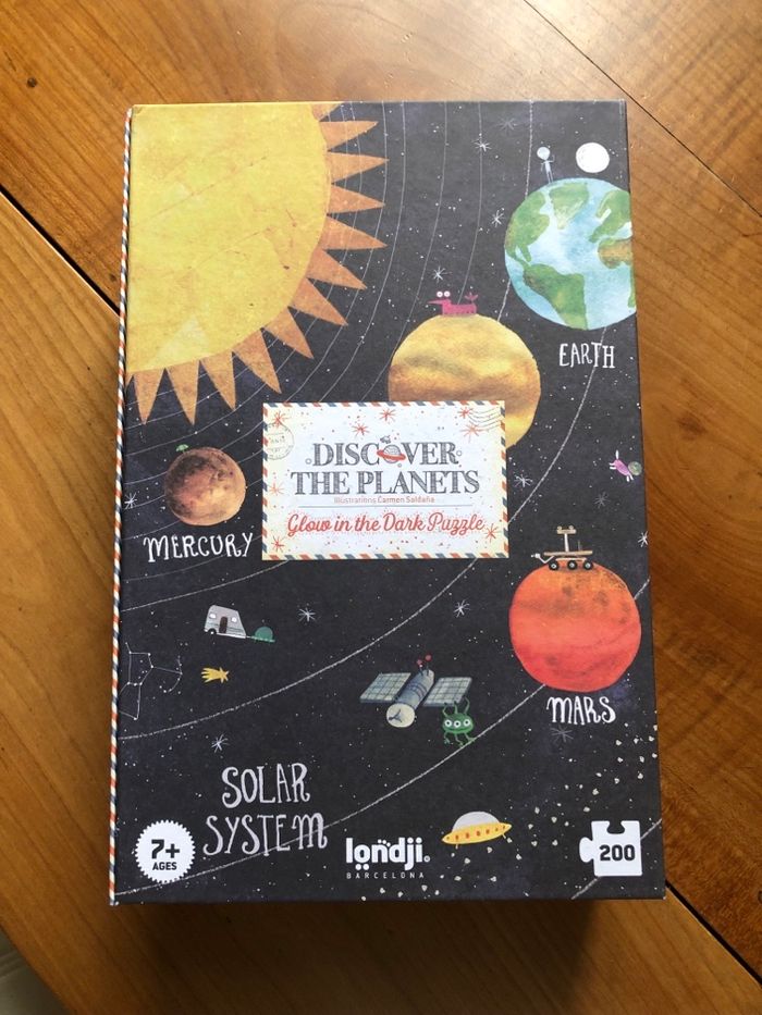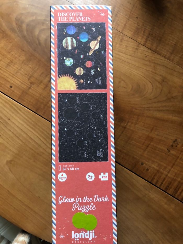 Puzzle Londji Discover the Planets NEUF avec etiquette. Apprendre a decouvrir les planetes en recomposant le puzzle. Les pieces brillent dans l obscurite, effet magique. 200 pieces, a partir de 6/7 ans. Fabrique en Espagne, en carton recycle. Prix public etiquette 30 euros. Londji est une marque reconnue pour ses puzzles magnifiquement illustres et de grande qualite, fabriques en Europe. Envoi soigne et rapide. Remise possible si achat de plusieurs articles sur mon profil.