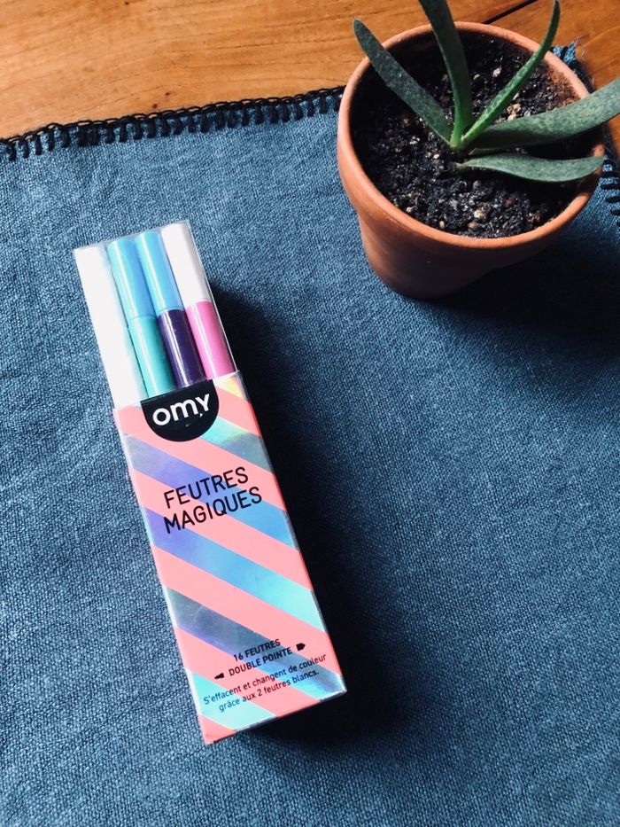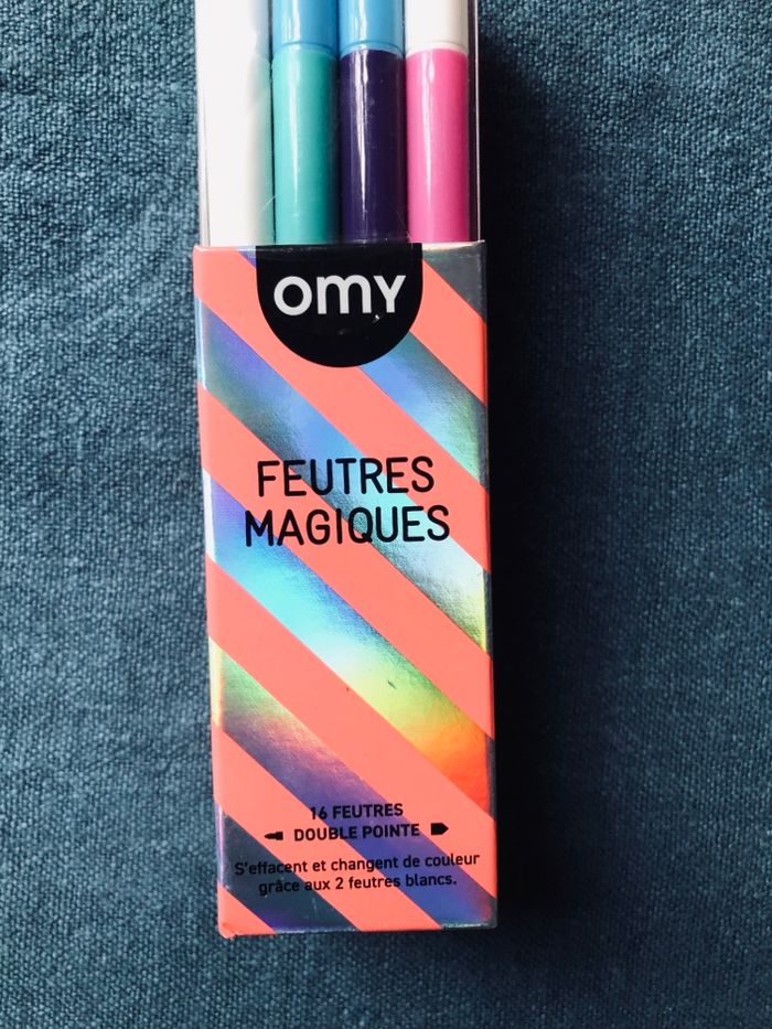 Boite de feutres magiques OMY NEUF avec etiquette. Les feutres s effacent et changent de couleur, hyper sympa. Double pointe fine et epaisse. Prix public etiquette 11,90 euros. OMY est une marque tres appreciee pour ses activites creatifs fun et graphiques, avec une belle qualite et des idees originales pour les enfants. Envoi soigne et rapide. Remise possible si achat de plusieurs articles sur mon profil.