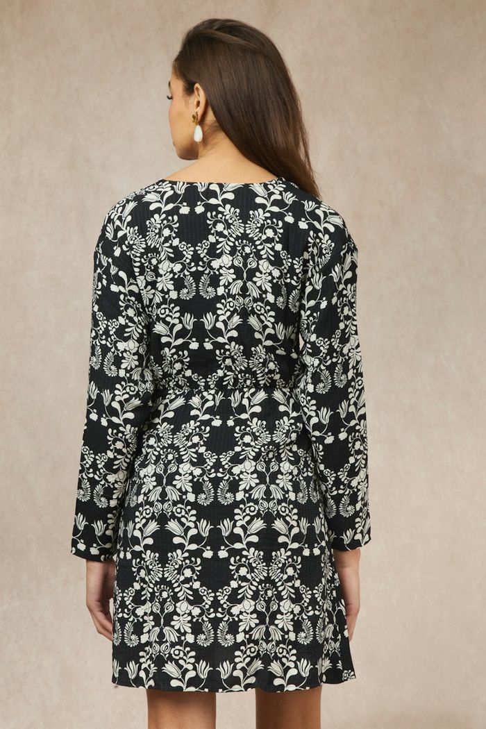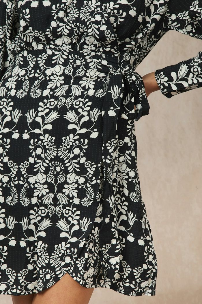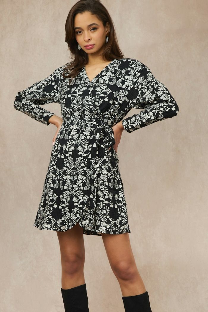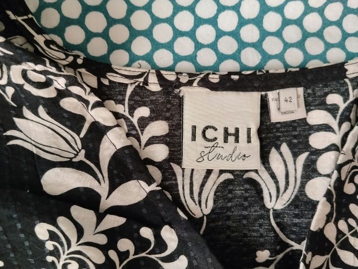 Robe Ichi ihgocina, taille 42. Neuve, jamais portée, erreur de livraison de box 'le closet' • Robe courte • Coupe portefeuille • Manches longues • Décolleté en V • Motif floral •Composition : 80% Viscose, 20% Polyamide Couleur : Noir, Imprimé