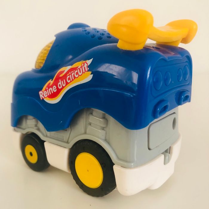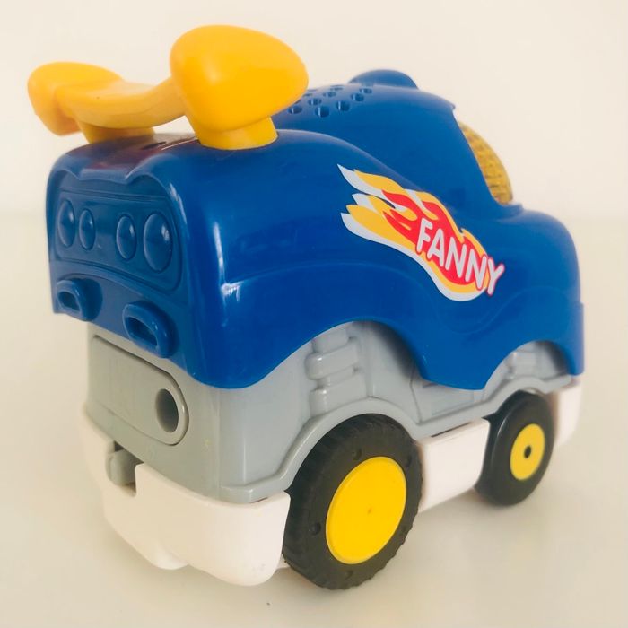 Je vends un véhicule interactif tutut bolide « Fanny Reine du circuit ». Quelques traces d’usure. Lorsqu’on appuie sur la voiture et qu’on lâche, ça la fait avancer. Musique, sons et lumière. Piles non fournies.