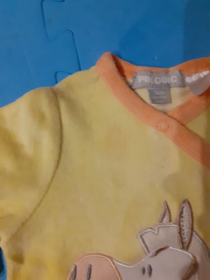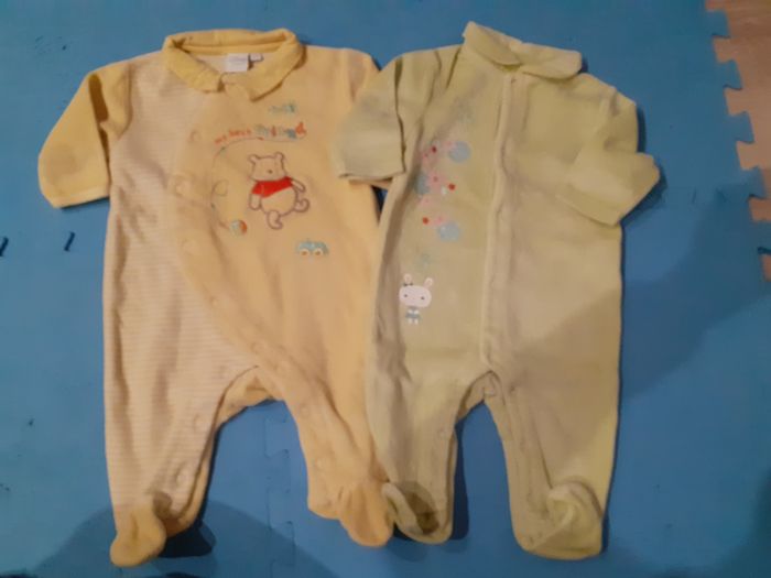 Vends lot de 2 pyjamas velours, mixte, 3mois. Le jaune est de marque Disney (Winnie), le vert clair est de marque Vert Baudet. Je donnexle jaune avec un zèbre car il a une petite tache (voir photo)