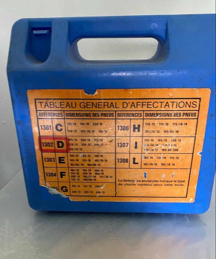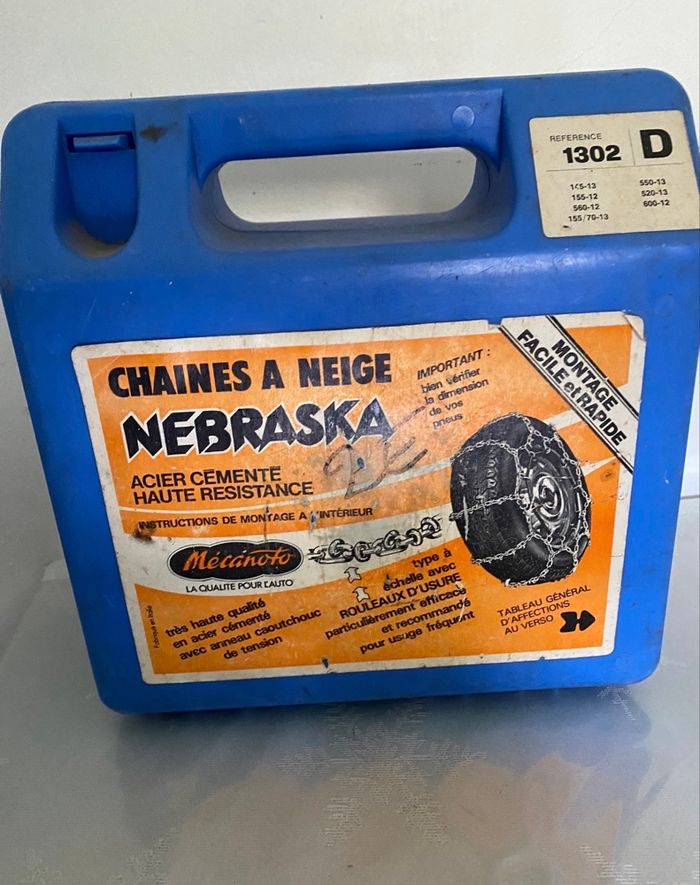 Chaînes à neige NEBRASKA – Mécanoto, en acier cémenté haute résistance. 🔖 Réf. 1302 D ✅Montage rapide et facile ✅Plusieurs dimensions ✅Modèle type échelle avec rouleaux d’usure, reconnu pour sa bonne accroche et sa durabilité sur neige et verglas. ✅Chaînes robustes en acier Les chaînes sont en bon état général, peu utilisées, propres et complètes. 📦 Contenu • 2 chaînes neige • Boîte de rangement rigide • Notice de montage