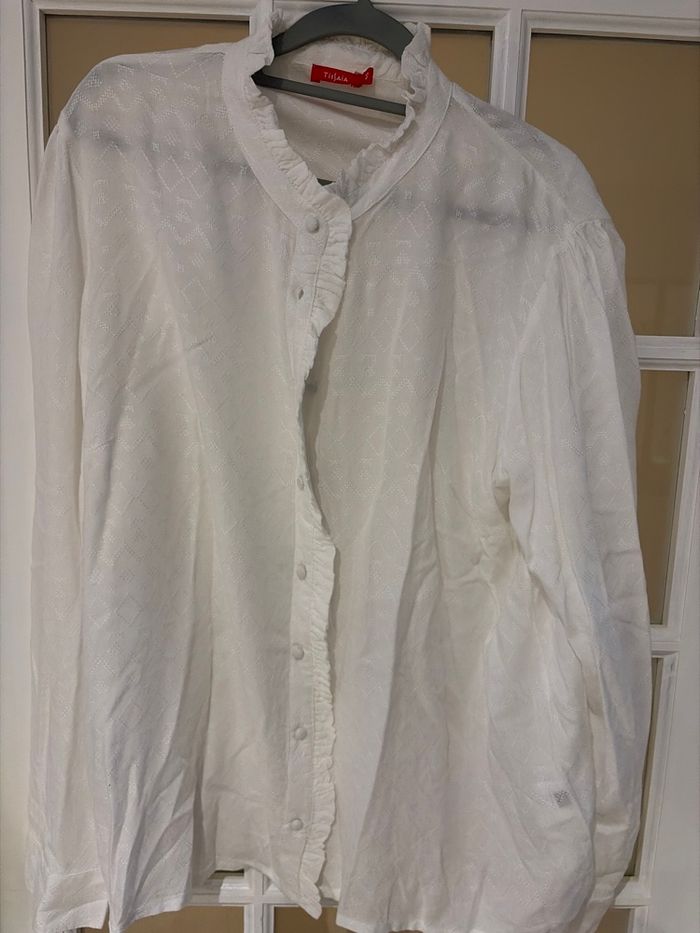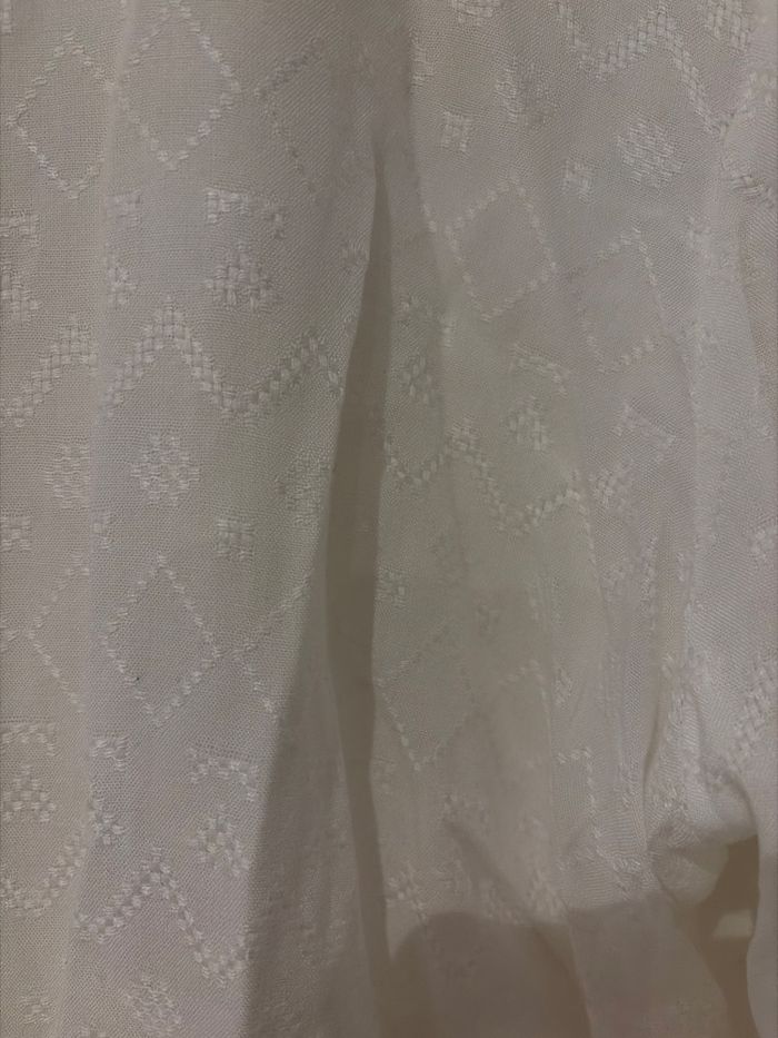 Très joli chemisier crème petits motifs dans le tissus dentelle au cou