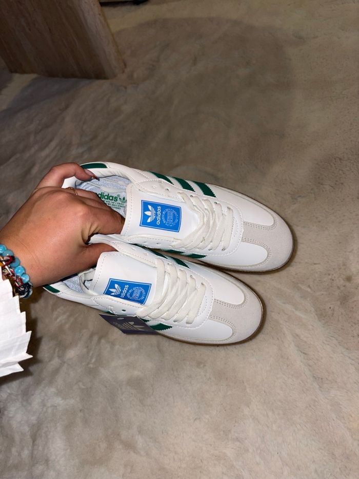 Baskets Adidas Handball Spezial neuves, jamais portées. Couleur blanche avec bandes vertes et semelle gomme. État impeccable, encore avec étiquette (voir photos). 👟 Taille : 41 📦 Envoi rapide et soigné ✔️ 100 % authentiques ❌ Pas d’échange N’hésite pas à me contacter si tu as des questions 😊