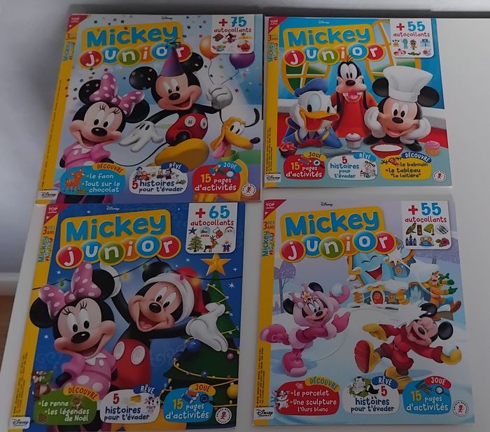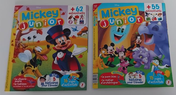 Bonjour, Je vous propose ce lot de 14 magazines de Mickey Junior. Ils sont en très bon état, seul la partie autocollants à été faite par ma fille, voir photos. Ils proposent 5 histoires pour s'évader, plus de 10 pages d'activités et à chaque numéro la découverte d'un nouvel animal de quoi éveiller la curiosité. Prix 8 euros.