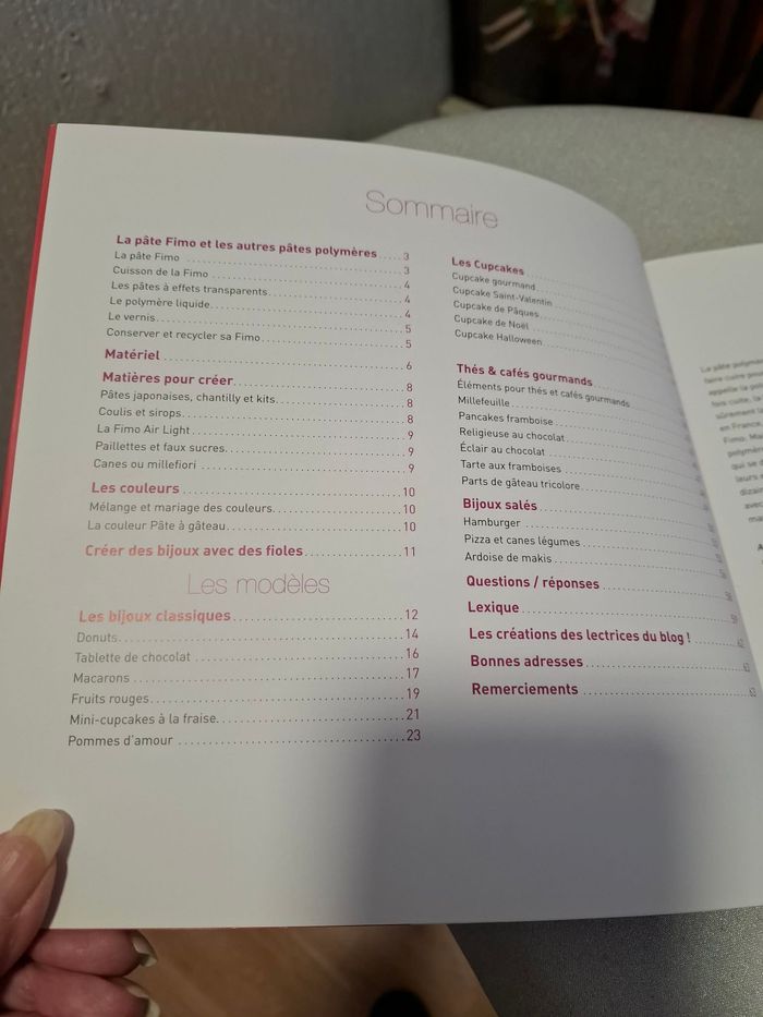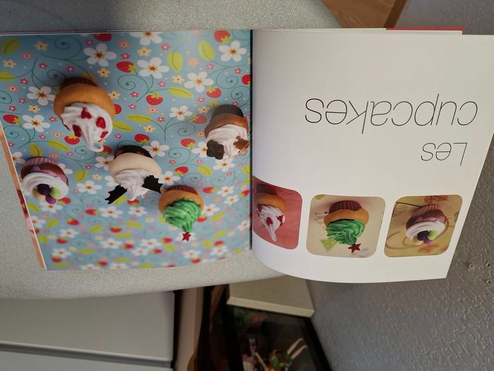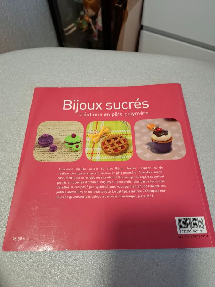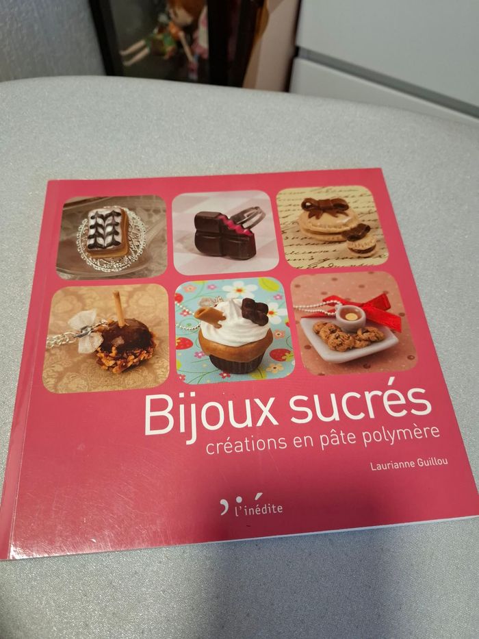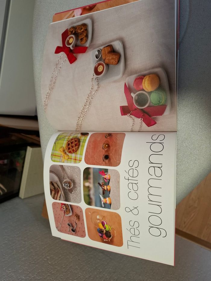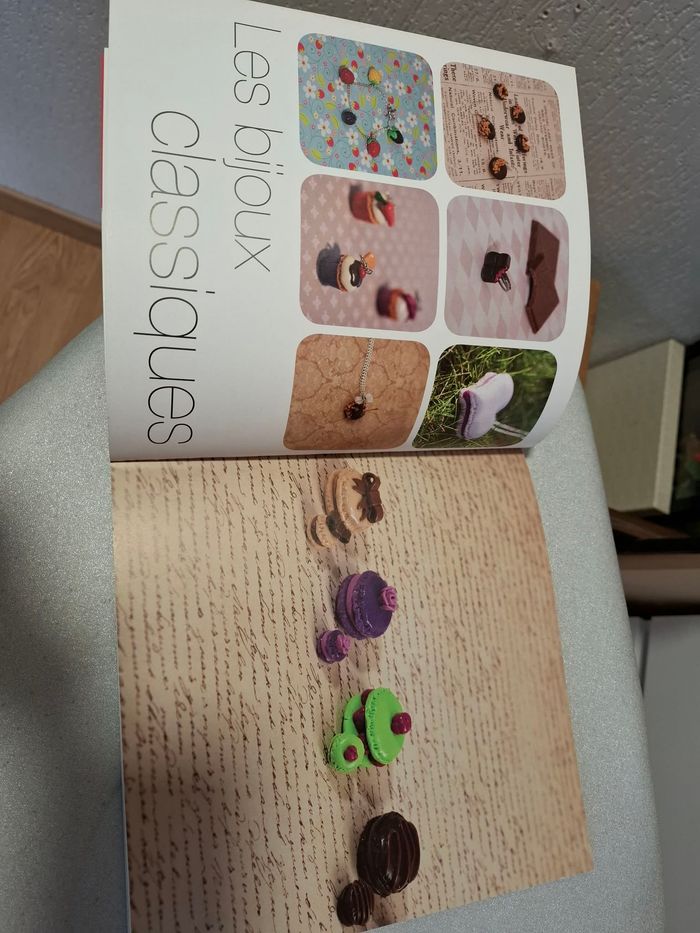 Joli livre pour créations de bijoux/breloques en pâte Fimo, nombreux modèles : donuts, tablette de chocolat, macarons, cupcakes, pommes d'amour, millefeuilles, éclairs, religieuses, tartes, hamburgers, pizzas, etc ...) Comme neuf. Acheté 15,50 €.