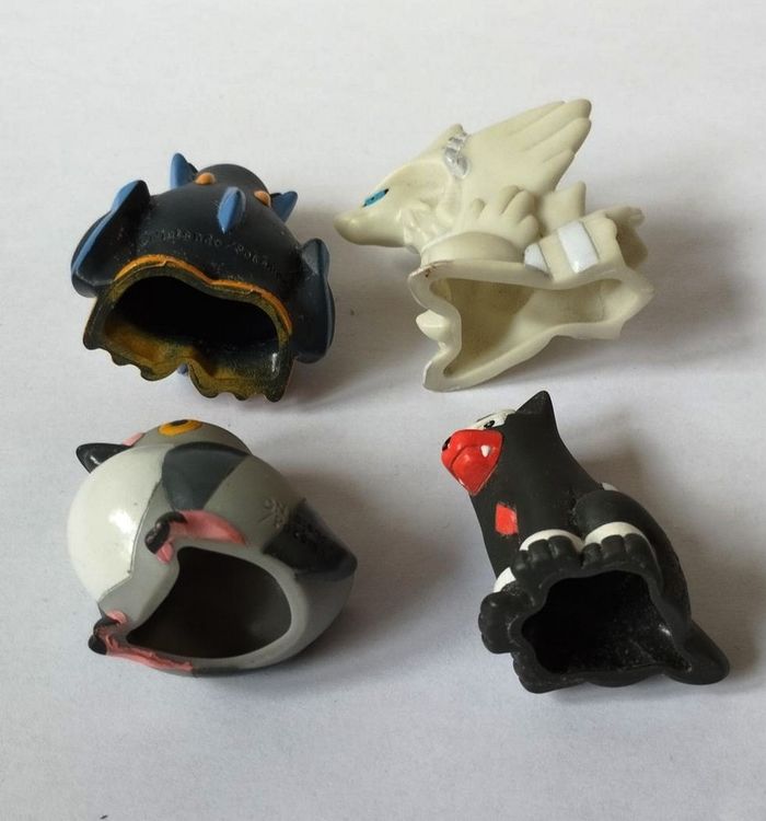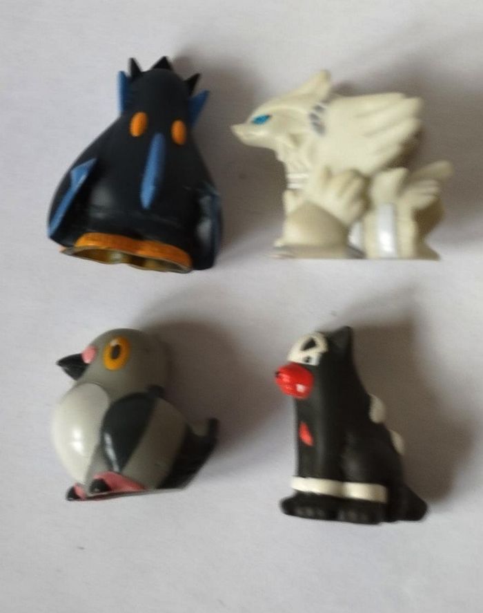 Lot de 4 figurines Pokémon Nintendo Bandai en plastique souple, creux Marionnettes à doigt "finger puppet" - Poichigeon / Pidove (2010) - Malosse (2001) - Pingoleon (2007) - Reshiram (2010) Hauteur 3,5 - 5 cm Taches et traces d'utilisation