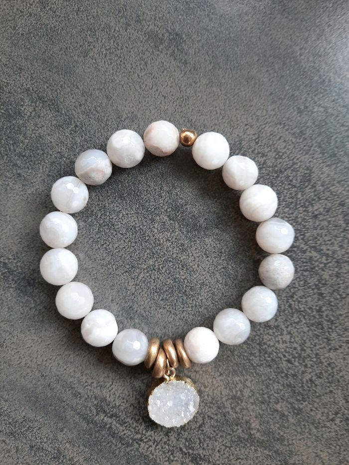 Bracelet en pierres naturelles Agates grises sur fil élastique. Perles de 10 mm facettées et perles de laiton plates. En très bon état, très peu porté.