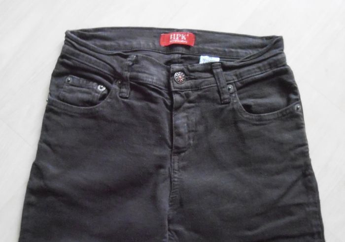 Jeans femme, coupe skinny, marque : HPK, taille 36 S, couleur marron foncé, avec un joli motif de cerises en strass brillants sur la poche droite arrière, matière : 98% coton, mesures à plat : longueur 104 cm, largueur 29 cm, fermeture : bouton métal et braguette, 3 poches avant, 2 poches arrière, possibilité de passer une ceinture. Très bon état. Un jeans féminin et confortable !