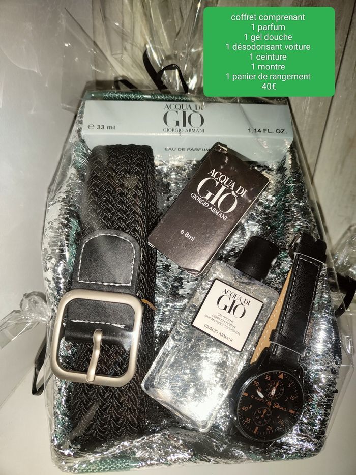 Coffret comprenant Un parfum 1 gel douche 1 désodorisant voiture 1 ceinture 1montre 1 panier de rangement