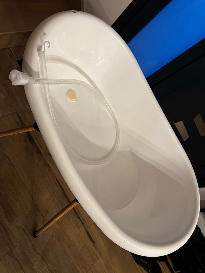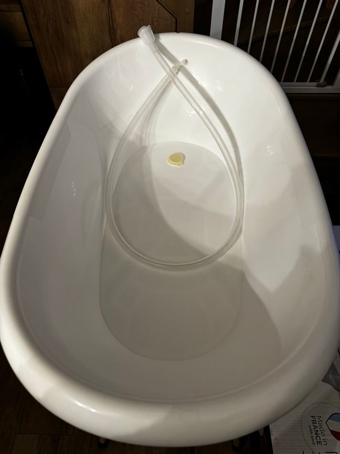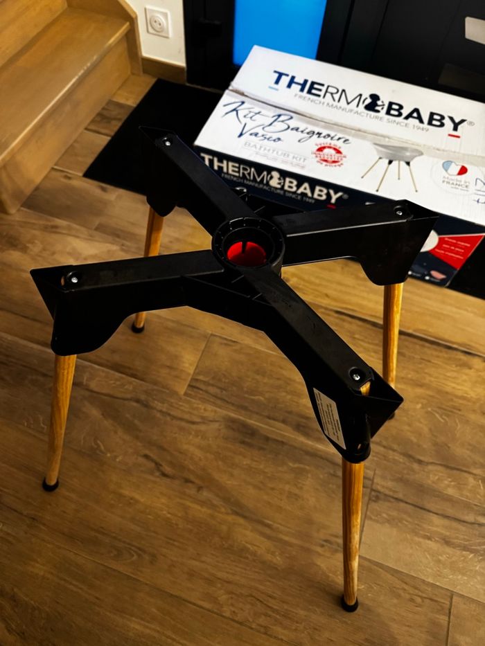 À vendre très bon état. KIT BAIN COMPLET : Le kit pour bébé de Thermobaby vous facilitera la vie. Il est composé de la baignoire VASCO, accompagné de son pied en bois pliable et son tuyau de vidange. Son design est moderne et épuré. GRAND CONFORT : En forme de vasque avec des bords arrondis pour le confort de bébé, cette baignoire bébé est l'innovation qui vous permettra de donner le bain sans devoir vous plier en 4. Peut accueillir un transat de bain. PRATIQUE & SIMPLE À RANGER : Les pieds sont pliables pour un rangement simple au sein de petits espaces et un véritable gain de place ! Quant au tuyau de vidange, il permet de vider le bain de bébé sans effort. INNOVATION BREVETÉE POUR LA SÉCURITÉ BÉBÉ : Grâce à un système d'accroche en croix innovant et breveté, la baignoire est solidement maintenue et stable pour éviter les risques de chute. Sécurité garantie pour l'enfant ! THERMOBABY, L'INNOVATION FRANÇAISE : Ancrée en Bretagne depuis sa création en 1949, Thermobaby fabrique des produits de puériculture. La société prône le made in France, un véritable gage de qualité.