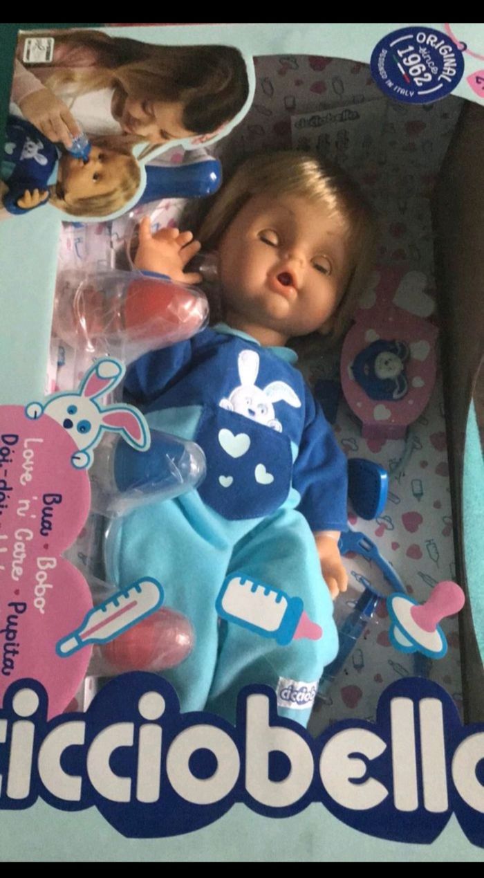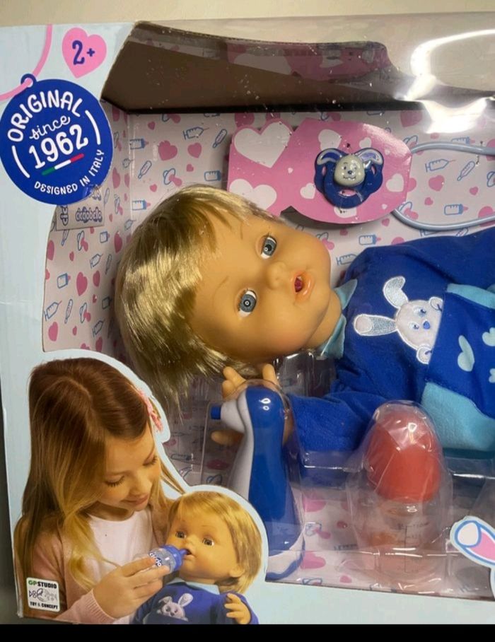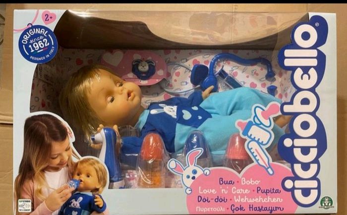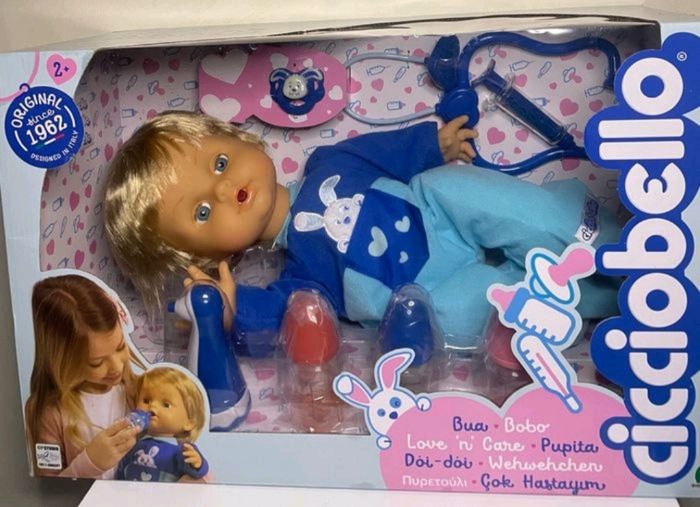 IL EST MALADE : Prends soin de ton Cicciobello Bobo. Il est malade, ses joues sont rouges...il a besoin que tu t'occupes de lui ! SOIGNE-LE :Trouve le bon médicament pour le guérir : biberon de lait et de miel, vitamines, sirop, piqûre. Essaie de voir si il va mieux... IL EST GUÉRI : Ses joues ne sont plus rouges. Regarde, il s'endort tranquillement quand tu lui donnes sa tétine magique qui brille dans la nuit. TAILLE : Le poupon mesure environ 42 cm. Carton abîmée mais jamais ouvert