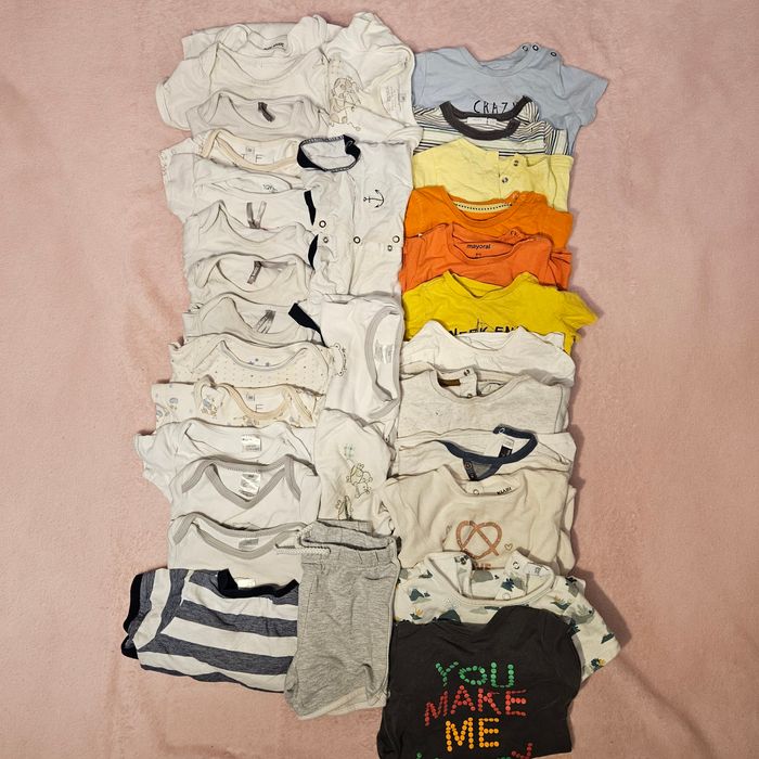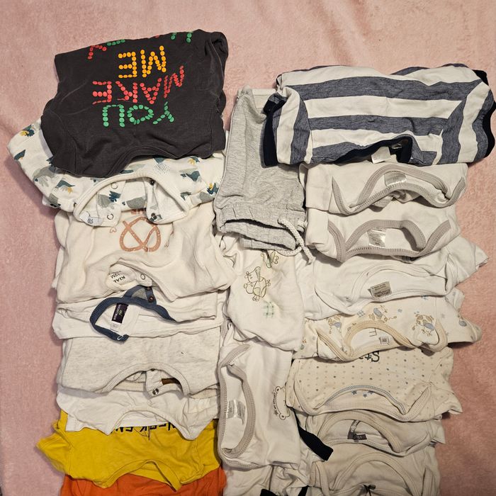 Un lot pour le/la pro des taches ou un lot de dépannage. Tous les articles présentent un défaut. Body, tshirt, short, pyjama Orchestra, Kiabi, Sergent Major, Mayoral dans le lot.