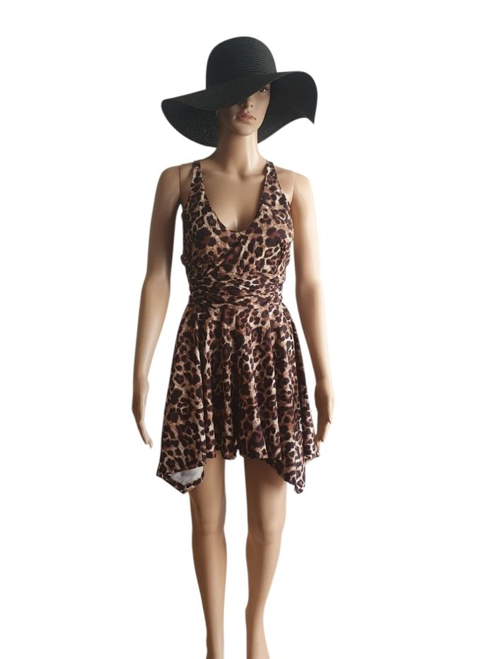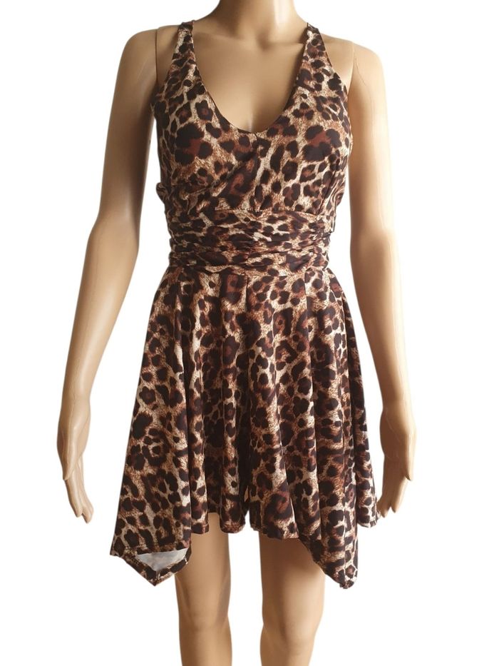Démarquez-vous avec ce combi-short unique qui allie le confort d'un short et et l'élégance d'une robe.  Son imprimé léopard vibrant et sa coupe travaillée en font une pièce  forte pour votre dressing d'été . ❤️ Contrairement aux coupes classiques,  le bas est taillé en pointes sur les côtés (coupe pyramidale). Cela crée un mouvement fluide et aérien à chaque pas, tout en allongeant visuellement la jambe.  🧡 Effet Trompe-l'œil : De face , l'ampleur du tissu donne l'illusion d'une petite robe asymétrique,  mais avec la praticité et la sécurité d'un short intégré.  🖤 Un magnifique jeu de fines bretelles croisées qui sublime le dos pour un look féminin et estival.    🩷 Décolleté en V Flatteuse qui met en valeur le port de tête.  💙 Taille Cintré : Large bande elastiquée (smocks) au dos pour marquer la taille sans serrer, s'adaptant parfaitement à votre morphologie.  🩵 Tissu très léger, fluide et doux, idéal pour les fortes chaleurs.  📏 Taille S (36) 🌟 Très bon état  💡 Suggestion Style: Sa coupe asymétrique se marie à merveille avec des sandales à lacets ou des espadrilles compensées pour accentuer l'effet "Jambes infinies"