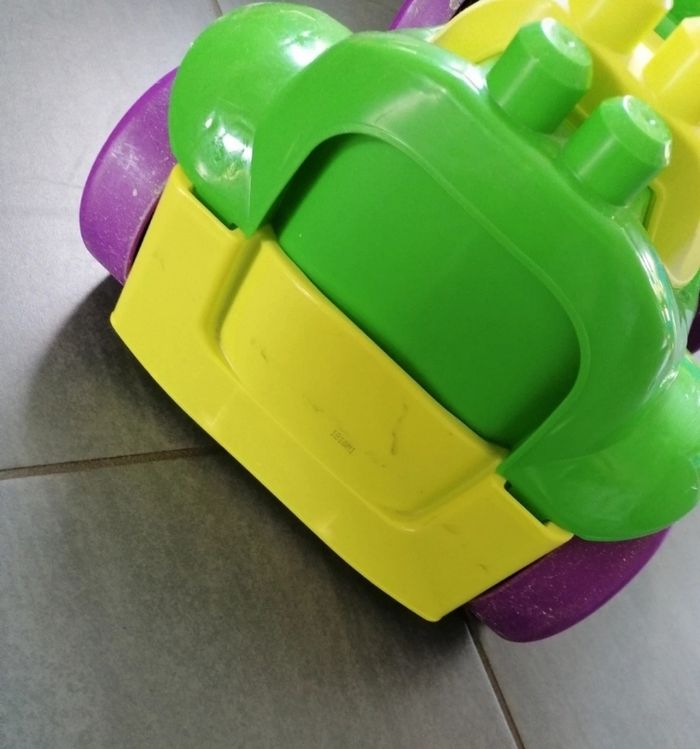 Porteur mega block, il ramasse les legos quand l'enfant passe dessus. Vendu sans lego mega block. Table mega block avec méga a block disponible dans mon dressing. Il est en très bon état, mais présente des marques/traces, ma fille la beaucoup utilisé.
