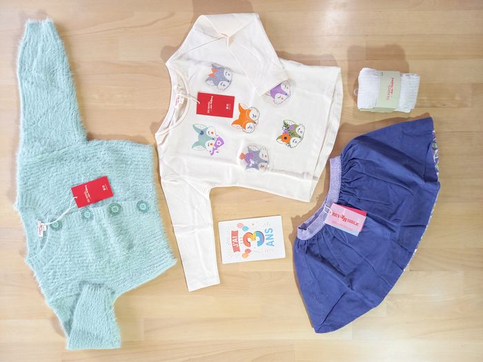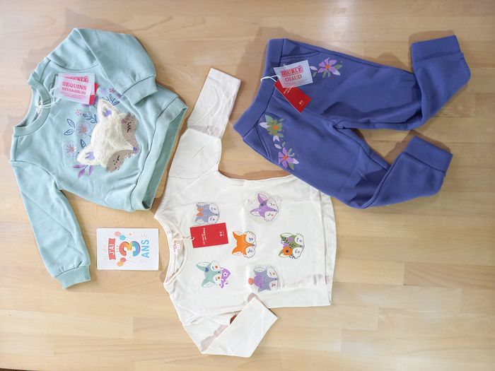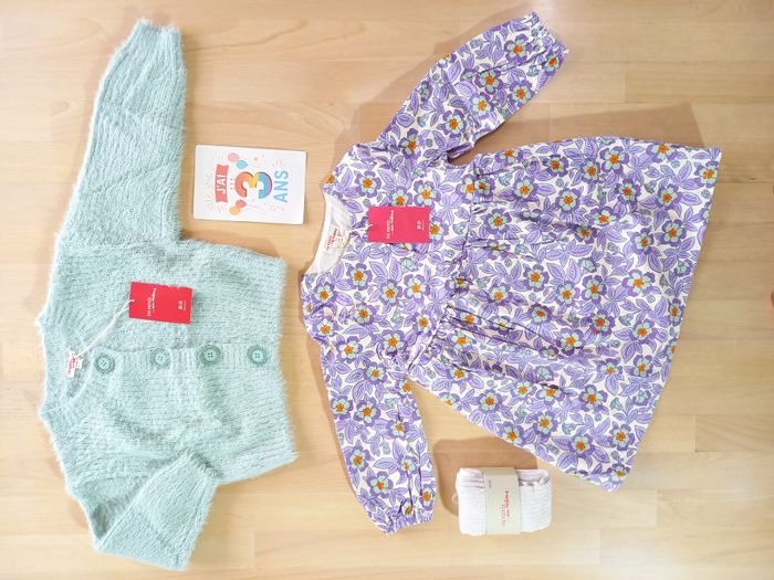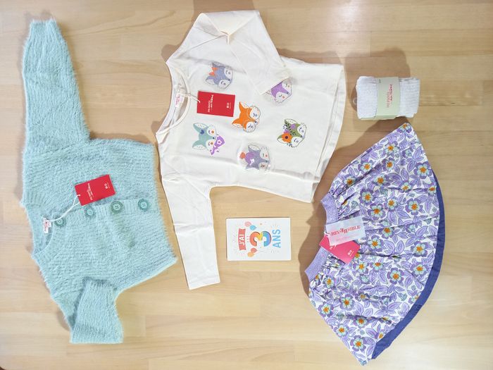 Bel ensemble 7 pièces de la marque Du pareil au Même, taille 3 ans, 98 cm. 🌼​ ​Ensemble idéal pour accueillir le printemps! 🐝 Vêtements issus du thème: Voir la vie en pastel 🎀 Je ne souhaite pas séparer le lot ​🎀 Nombreuses autres photos sur demande Ayant un grand dressing pour ma puce, ce lot est resté entièrement neuf et étiqueté 🏷 Il se compose de: - une paire de collant écrue, pointure 23/26, étiquetée 🏷 - un t-shirt écru motif renards colorés, étiqueté 🏷 - une robe à manches longues, écrue fleurie et parme / lilas / violette, en velours fin, étiquetée 🏷 - une jupe réversible, avec une face au même imprimé que la robe et l'autre face violette, en velours fin, étiquetée 🏷 - un cardigan / gilet en grosses mailles très douce avec gros boutons au contour pailleté, étiqueté 🏷 - un sweat vert clair, molletonné tout doux à l'intérieur, avec tête de renard en fourrure à sequins réversibles - un jogging violet, molletonné tout doux à l'intérieur, étiqueté 🏷 ✨ N'hésitez pas à vous abonner à mon profil pour suivre mes nouveautés. Beaucoup de Sergent Major à venir! 🎀​​ Articles 100% fille dans mon dressing, taille 24, 36 mois et 3 ans, des articles de puériculture, et des jouets de la naissance à 6-7 ans. ✅​ Possibilité de faire des lots. Livraison rapide et très soignée.