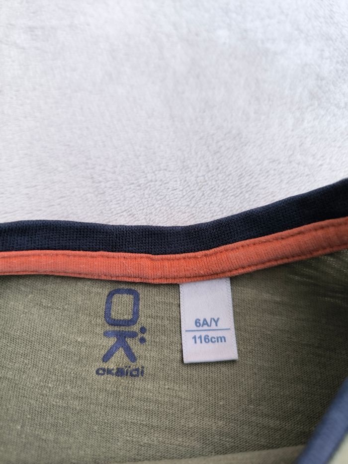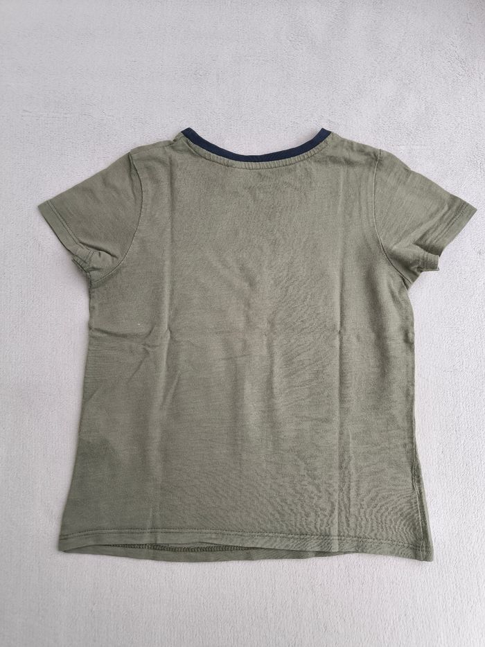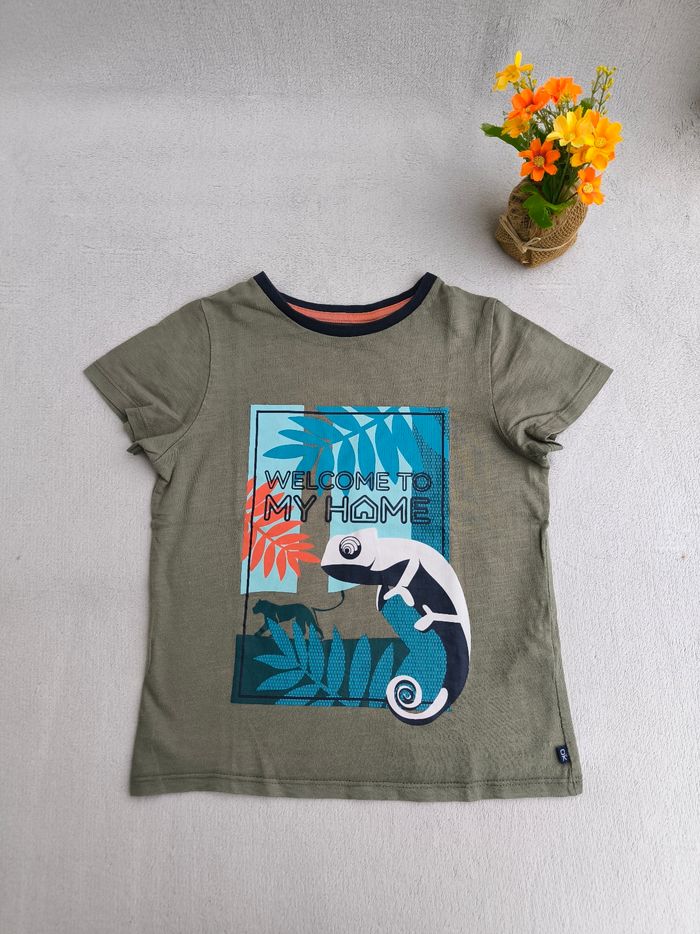 T-shirt à manches courtes Marque Okaïdi Taille 6 ans, 116 cm • Coloris kaki, bleu, marine, blanc, orange • Inscription "Welcome to my home", imprimés feuilles, panthère, caméléon • Coton fin En très bon état #evelyne_garcons_6ans #evelyne_garcons