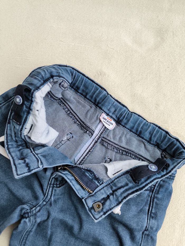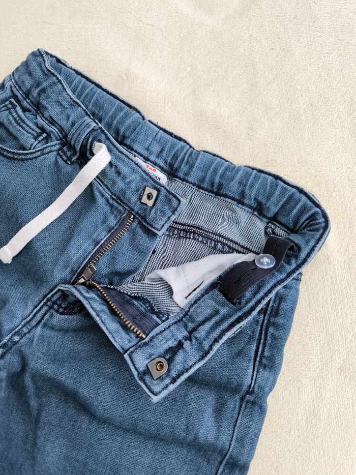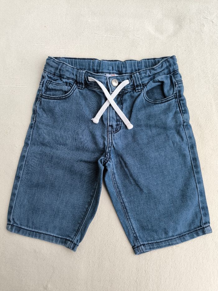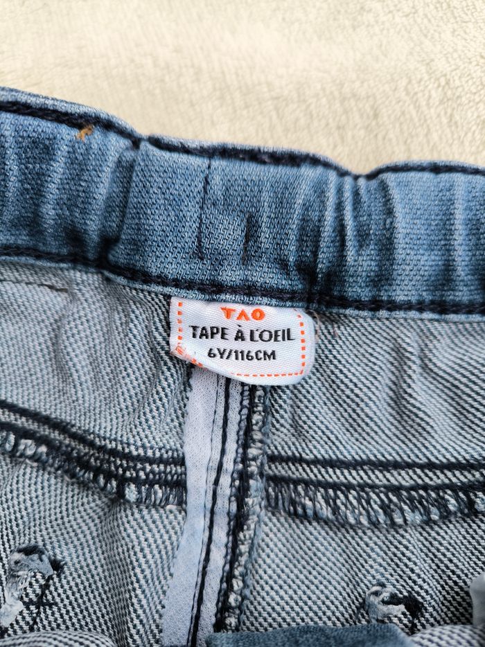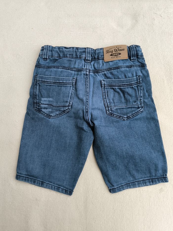 Short / Bermuda en jean Marque Tape à l'œil Taille 6 ans, 116 cm • Coloris bleu • Carton avec inscription "Venice Beach, big wave 1983 surf shop" • Effet griffé sur une poche • Fermeture par fermeture éclair et crochet • Taille élastique ajustable et avec cordons • 4 poches • Coton En très bon état #evelyne_garcons_6ans #evelyne_garcons