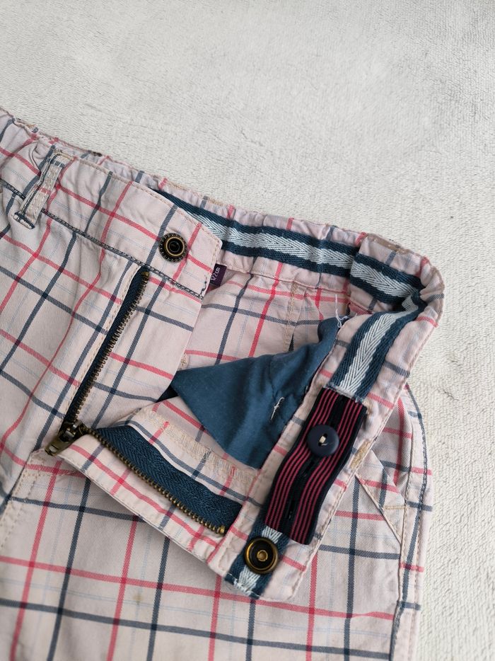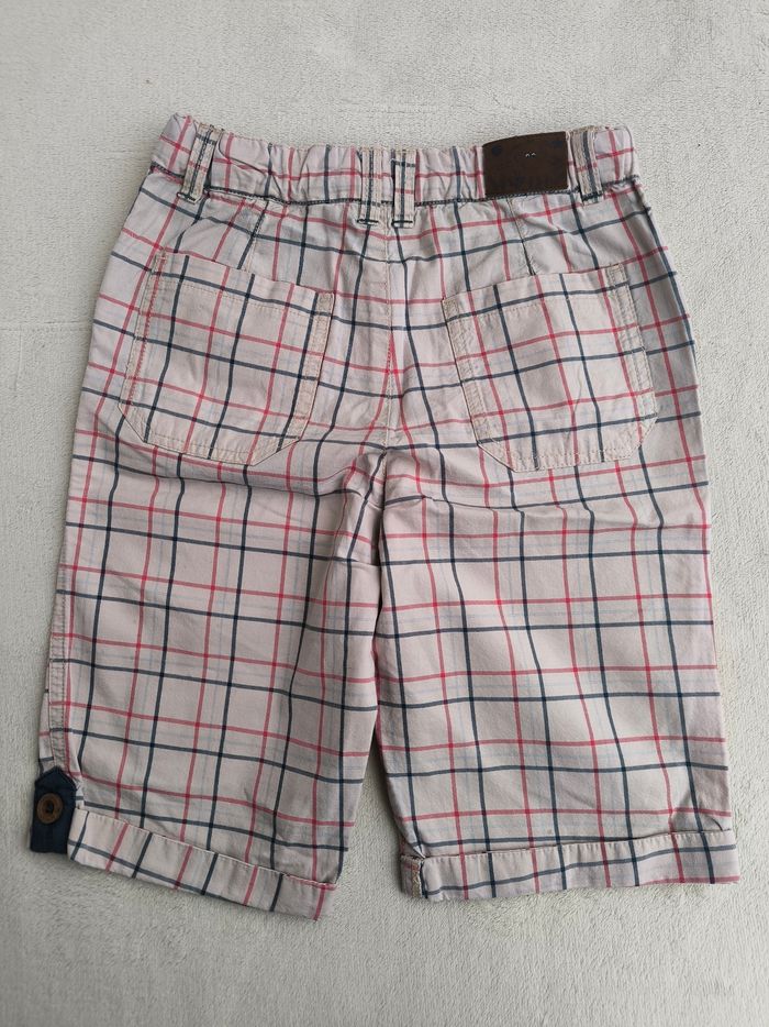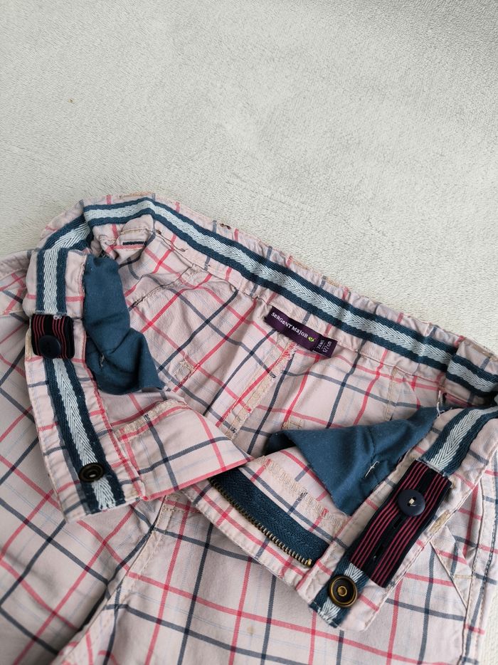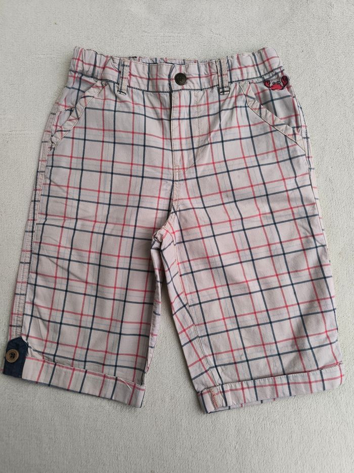Short / Bermuda Sous la mer Marque Sergent Major Taille 7 ans, 122 cm • Coloris rose pâle, rouge, bleu, marine • Imprimés carreaux, broderie crabe • Fermeture par fermeture éclair et pression • Taille élastique ajustable • 4 poches • Revers bas des jambes • Tissu fin • Petite tache à l'avant En très bon état #evelyne_garcons_7ans #evelyne_garcons