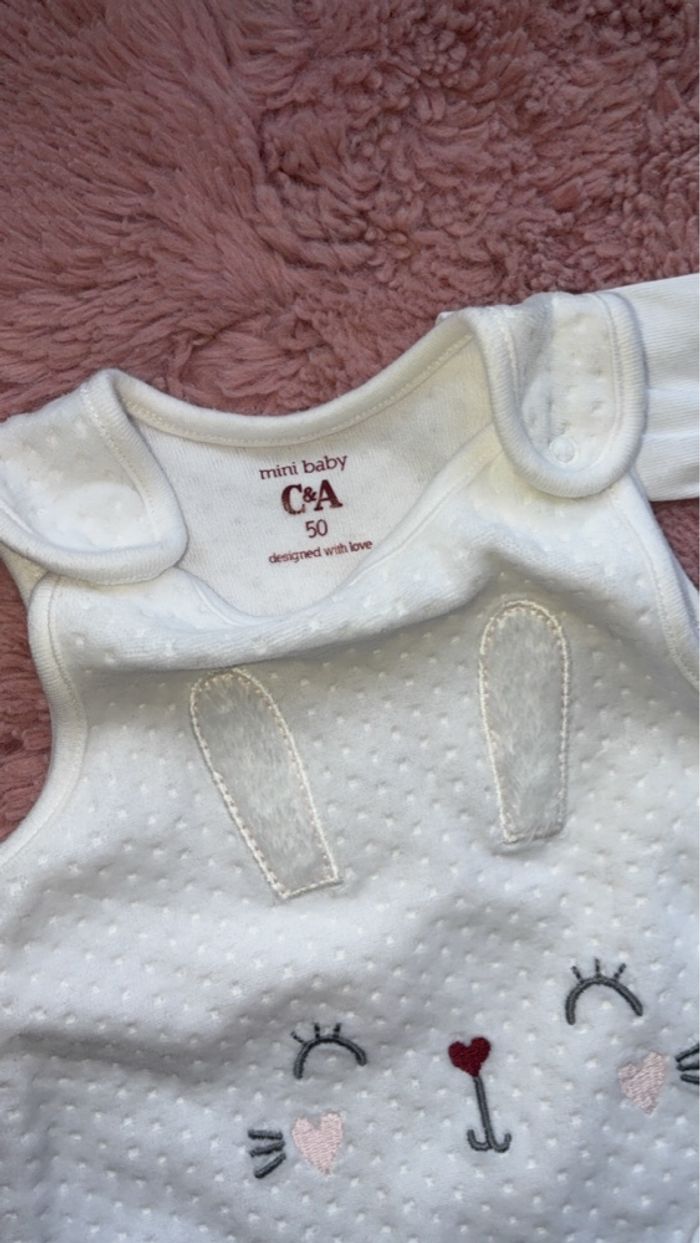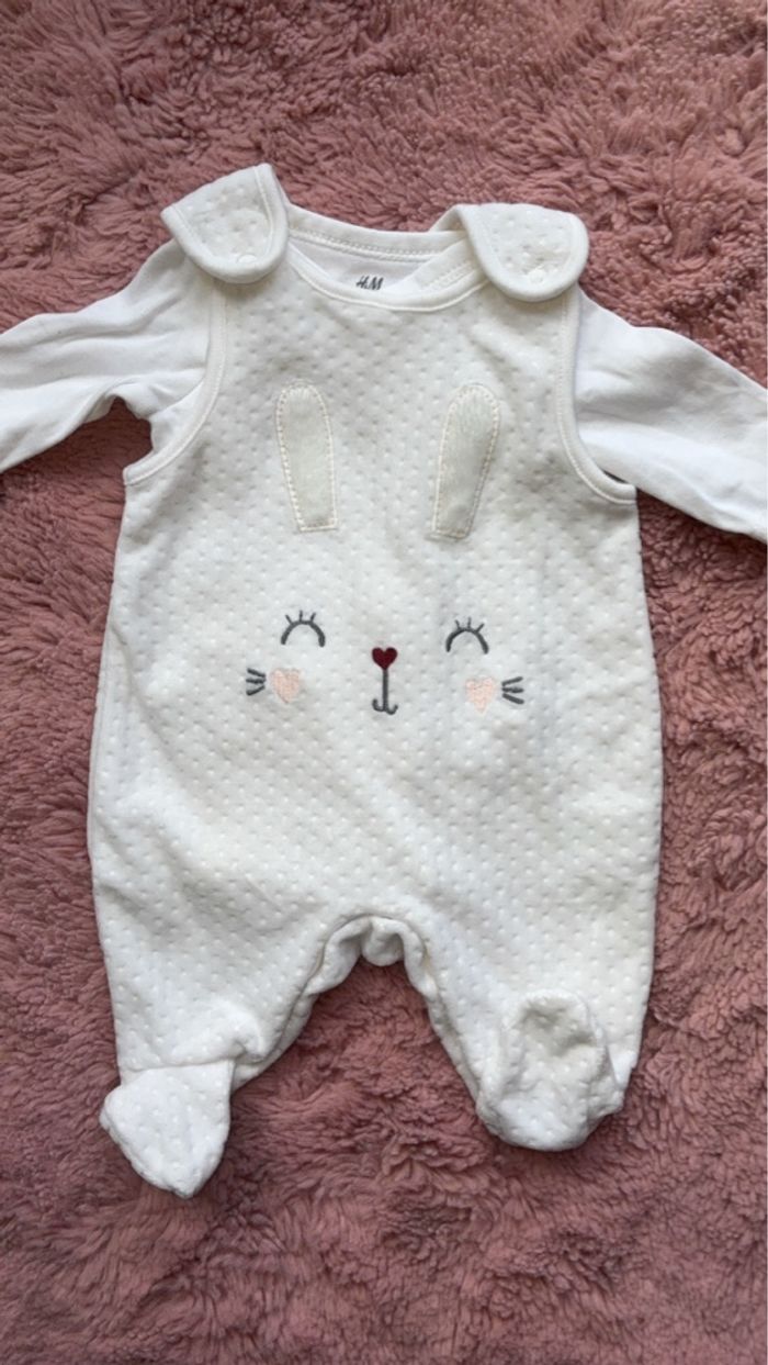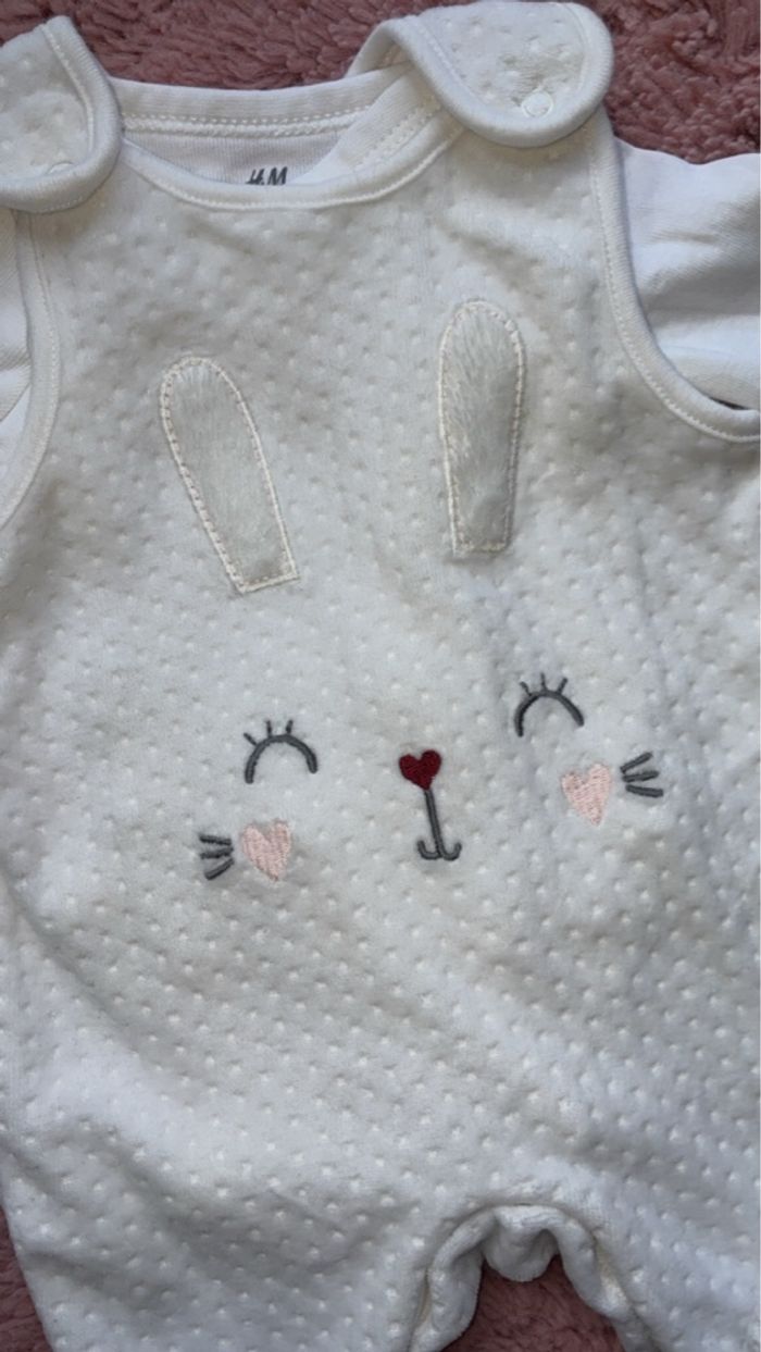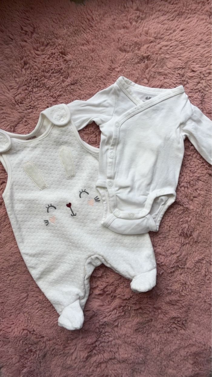 Magnifique ensemble deux pièces taille 50 cm de la marque C&A pour la salopette , taille 0-1 mois de la marque H&M pour le bodie manche longue en très bon état.