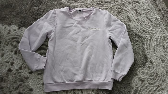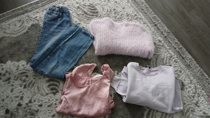 Un jean vertbaudet Un haut rose satiné h&m Un pull mauve gémo Un sweat mauve tape a l'œil
