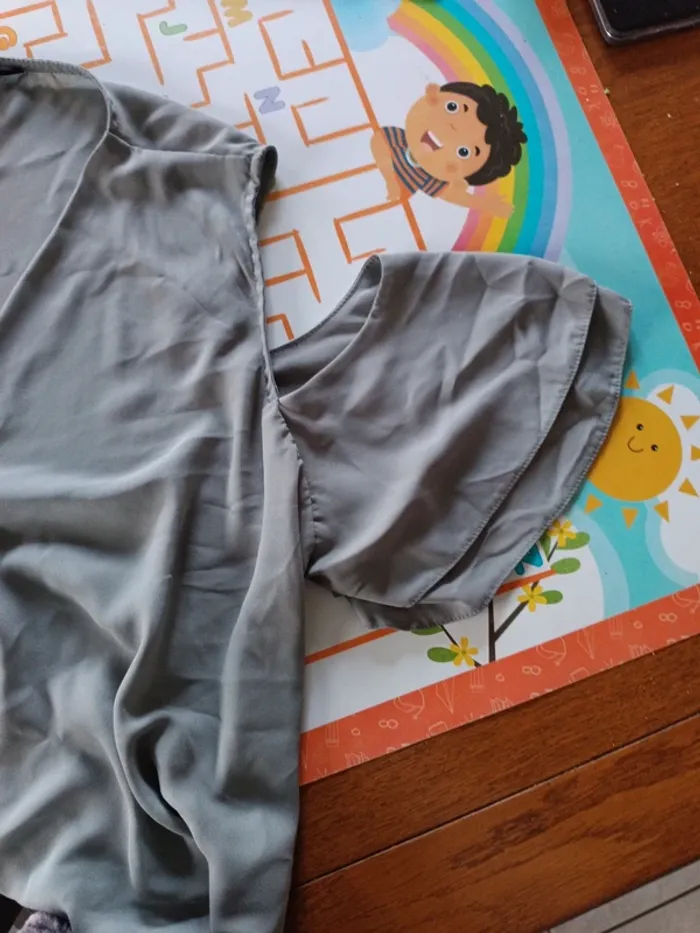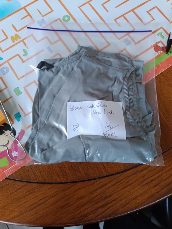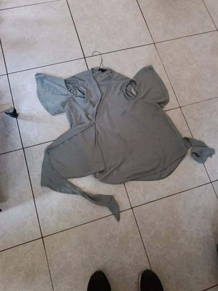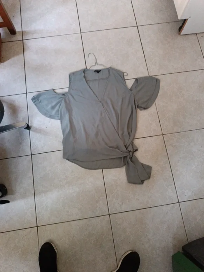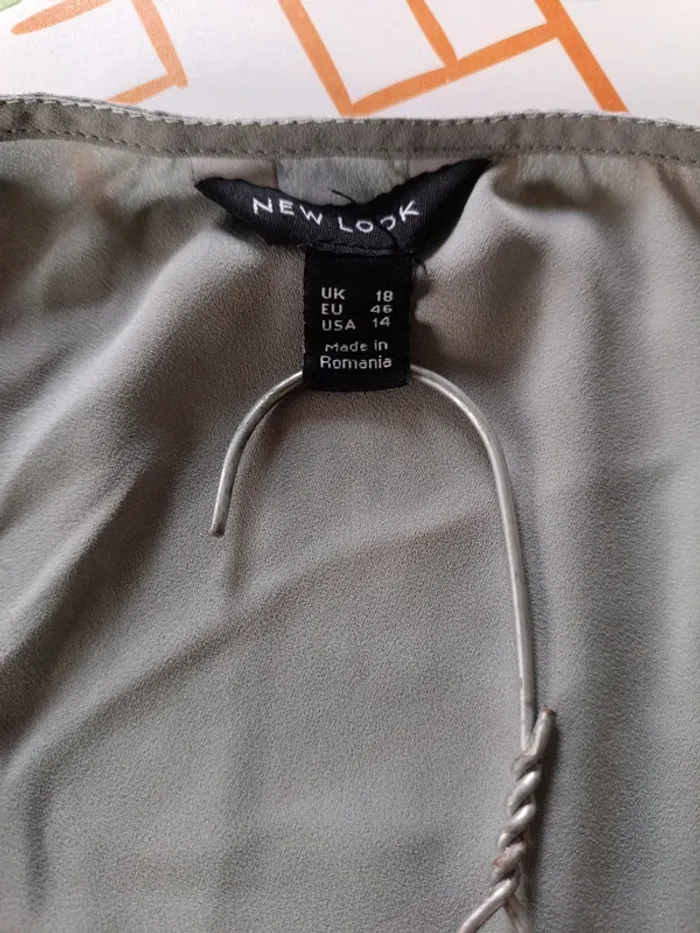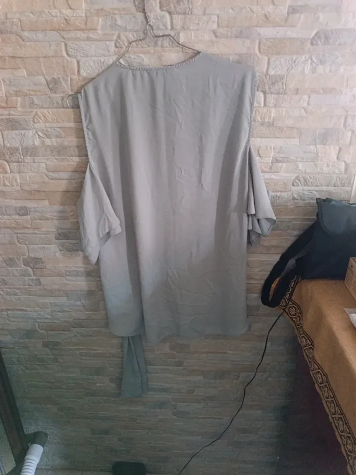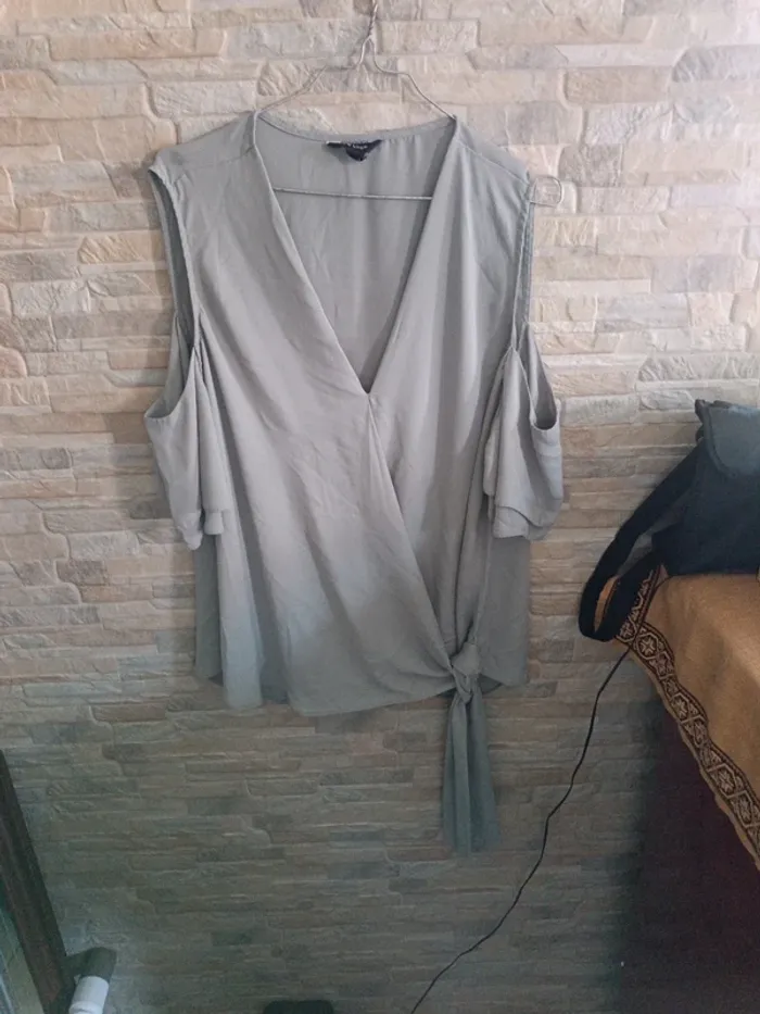 Blouse kaki clair New Look 46. Épaules ouvertes avec manches sur côtés bras. Carrure 40 cm. Aisselles 56 cm. Longueur 70 cm. Fermeture croisée devant avec lien foulard pour former un nœud. 100% polyester. TBE