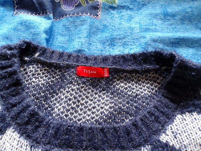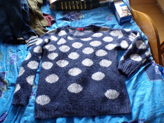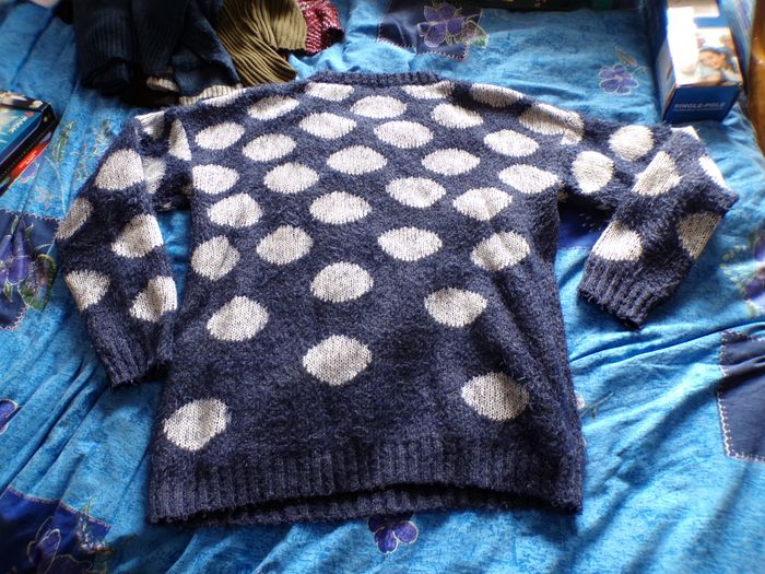 Pull tout doux bleu marine avec de gros pois blancs. Taille 42/44, marque Tissaia. Très bon état.