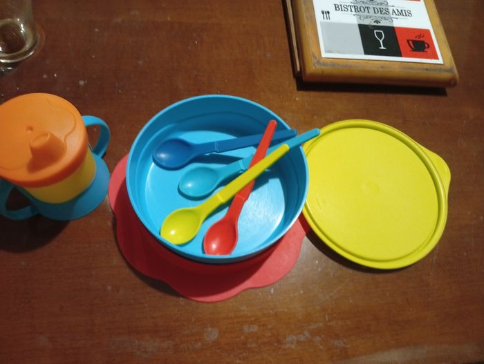 Ensemble repas tupperware comprenant le verre évolutif, l'assiette anti dérapante avec son couvercle et des cuillères . Bon état