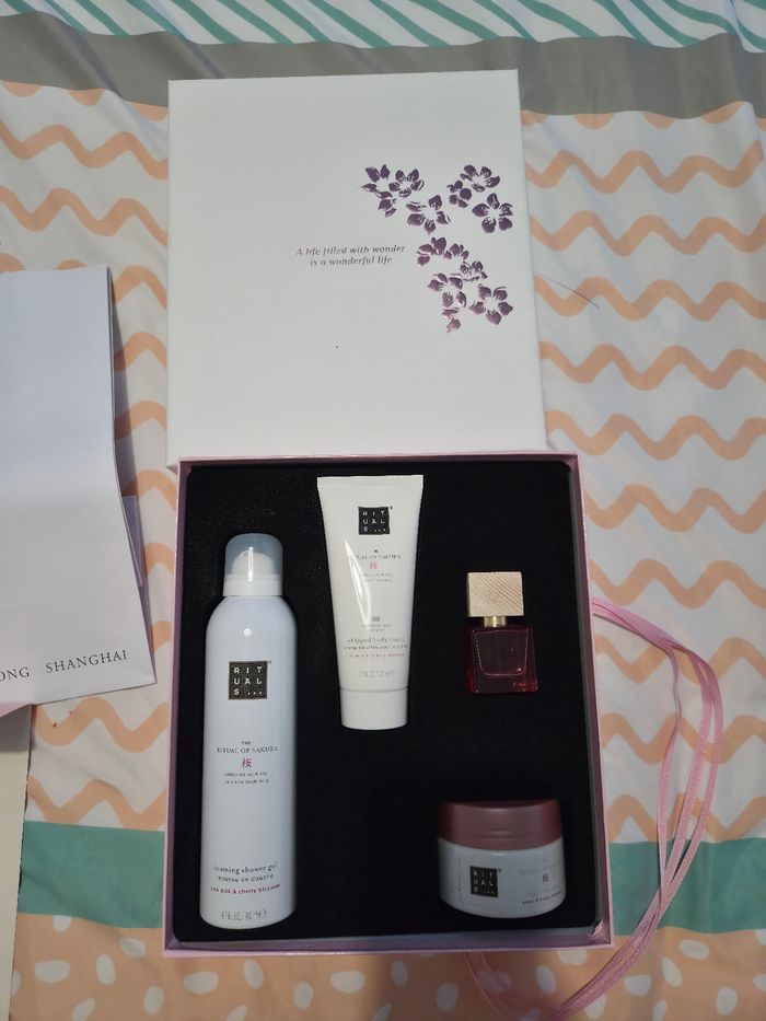 Coffret ritual of sakura neuf mousse de douche 200 ml, gommage pour le corps 125 g, crème pour le corps 100 ml, eau de parfum 15 ml. #rituals #ritualofsakura