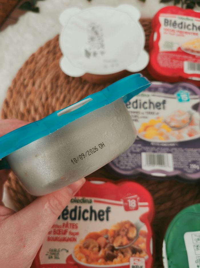 Plats Bledichef • Purée épinards saumon 12 mois - 10/09/26 • Couscous 12 mois - 21/08/26 • Hachis parmentier 12 mois - 10/10/26 • Pâtes bourguignon 18 mois - 24/11/26 • chou fleur béchamel 15 mois - 03/10/26 • Curry légumes coco cabillaud x3 - 03/06/26