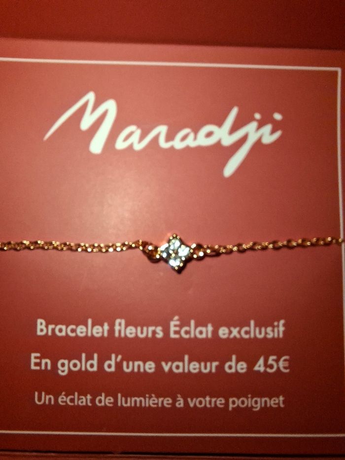 Je vends ce magnifique bracelet de la marque française Maradji, modèle "Fleurs Éclat". C’est une édition exclusive, très élégante et fine, parfaite pour porter au quotidien ou pour offrir. ​État : Neuf (jamais porté, encore sur son support d’origine). ​Détails : Pendentif en forme de fleur/trèfle serti de 4 cristaux brillants. ​Couleur : Finition dorée (Gold). ​Fermoir : Mousqueton avec chaînette de réglage pour s'adapter à toutes les tailles de poignet. Petit médaillon gravé "Maradji" au bout de la chaîne. ​Valeur boutique : 45 € (indiqué sur le support). ​Un bijou délicat qui apporte un bel éclat de lumière au poignet !