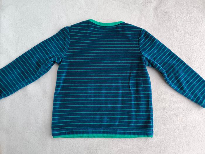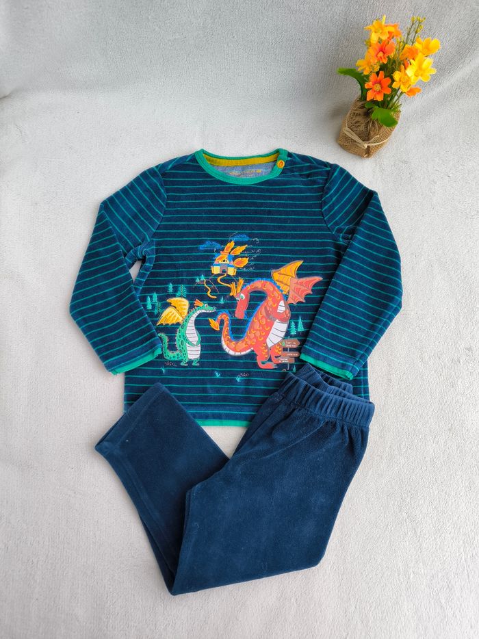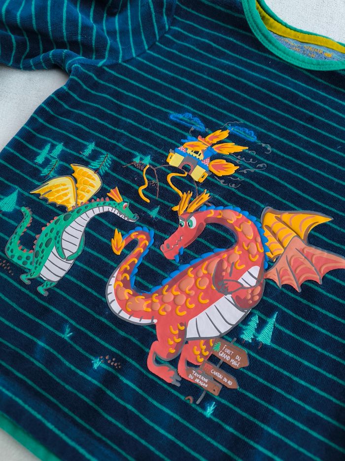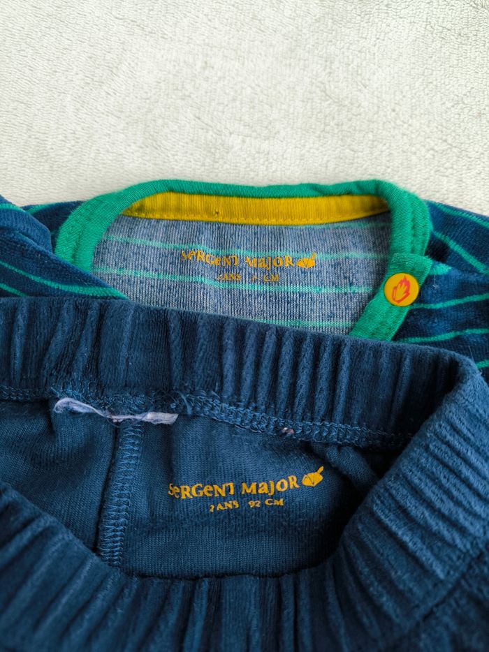 Pyjama deux pièces Marque Sergent Major Taille 2 ans, 92 cm Haut : • Coloris marine, turquoise, vert, jaune, orange... • Manches longues • Imprimés en texture dragons, château, broderies sapins, inscription "Forêt du Grand Mage, château du roi, taverne du dragon", rayures horizontales • Pressions au col • Velours, doux • Filet intérieur enlevé Pantalon : • Coloris marine • Taille élastique • Velours, doux En très bon état #evelyne_garcons_24mois #evelyne_garcons