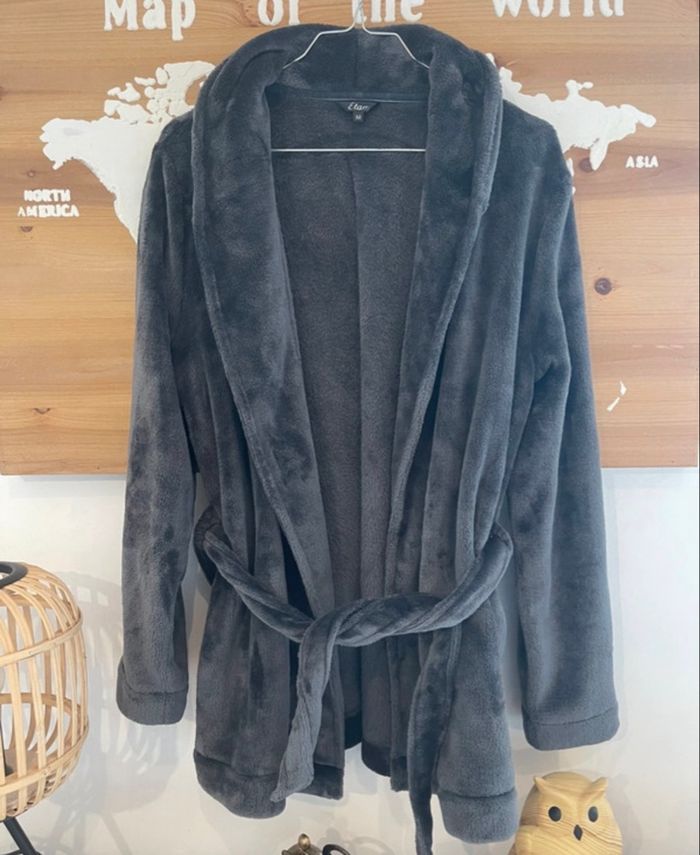 Peignoir / gilet d’intérieur gris très doux et confortable. Matière type polaire/velours, idéal pour rester au chaud à la maison. Avec ceinture à nouer à la taille et col châle. Très bon état, agréable à porter.