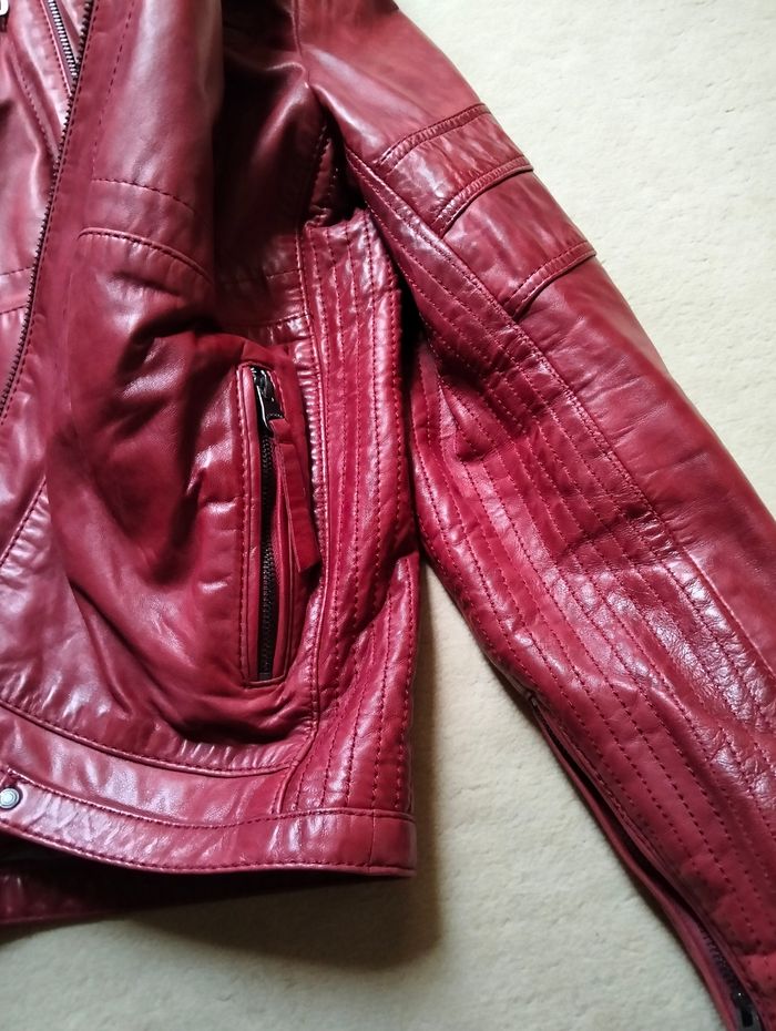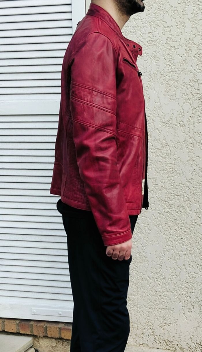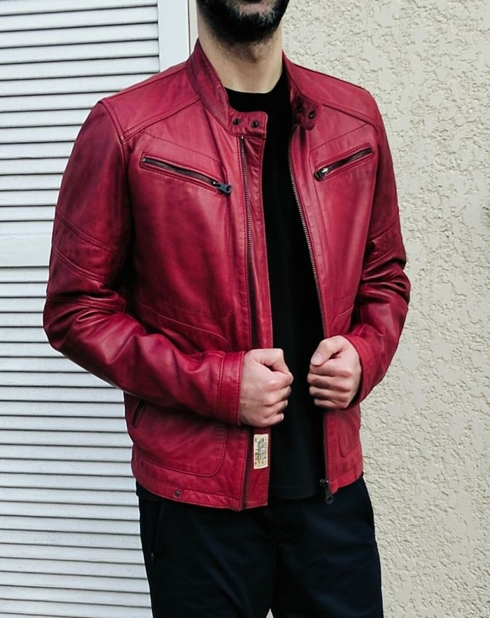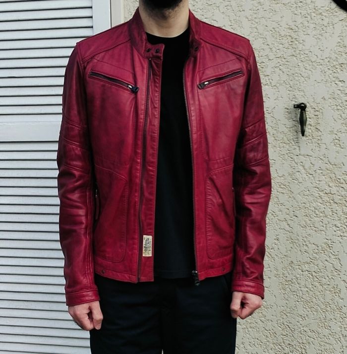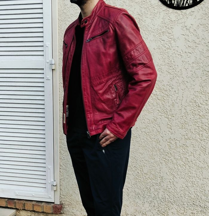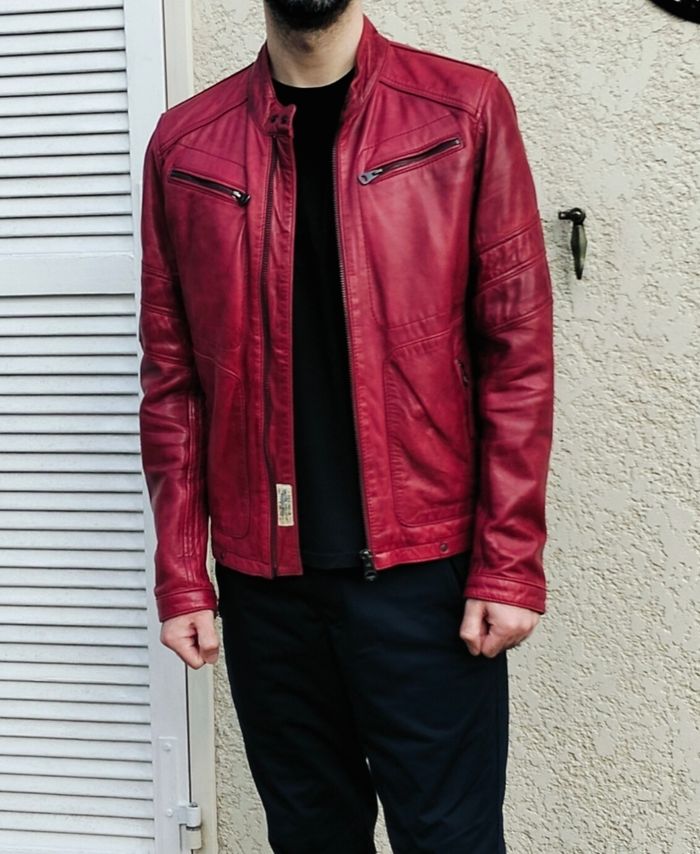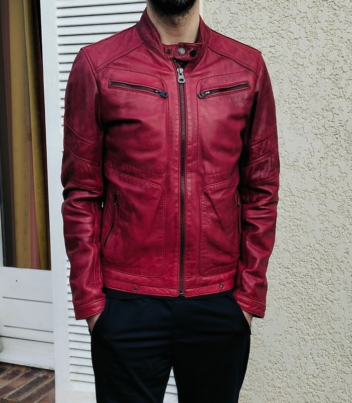 Blouson en cuir d'agneau rouge haut de gamme Redskins Clayton Mojito de taille M (je fais 1,82m/72kg sur les photos). Peau souple et brillante effet vintage. Comme neuf, très peu porté, fermetures en parfait état.