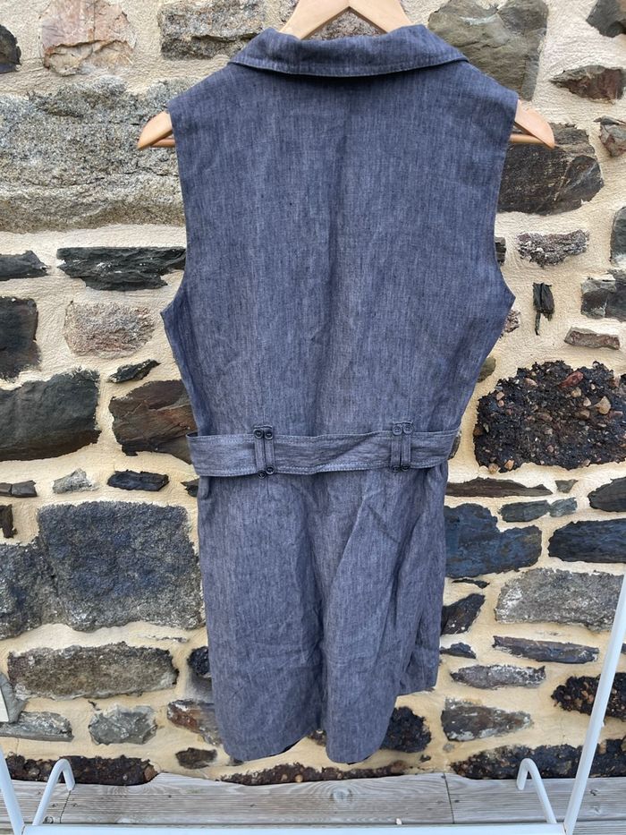 Robe chic en lin épais sans manche Doublée avec une ceinture avec boucle à la taille Couleur gris chiné Taille 40/42 (étiquette couper) Dimension : Aisselle à aisselle : 50cm Hauteur : 92cm Tour de taille : environ 86cm Très peu porter Caroll