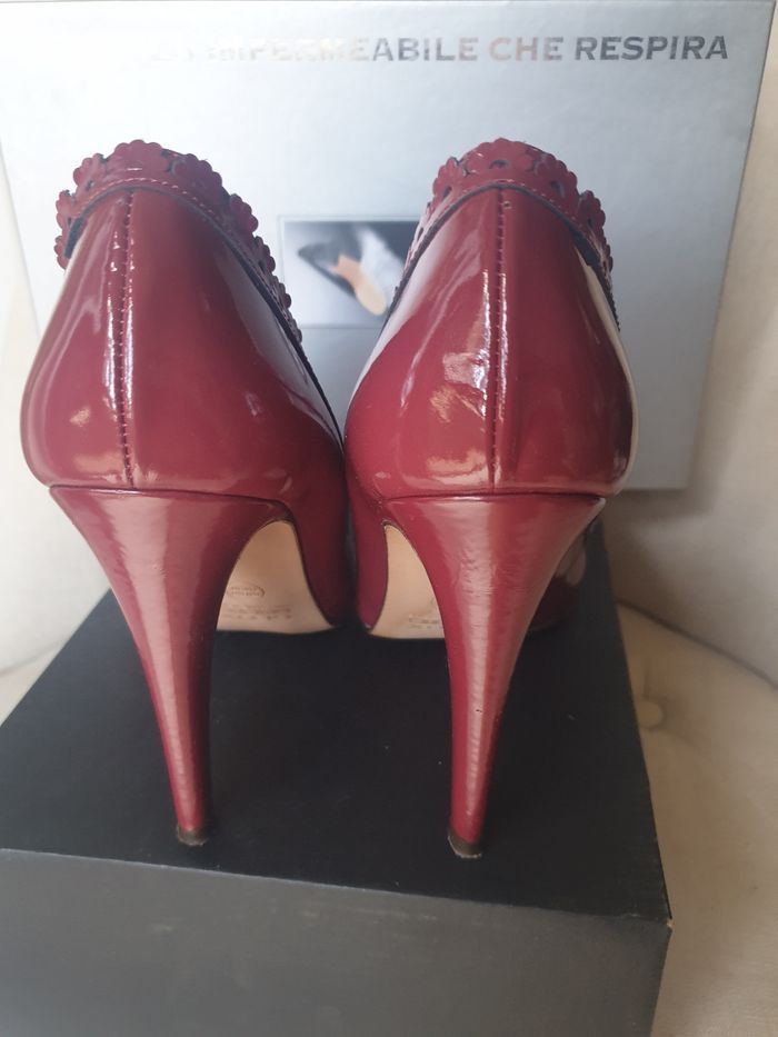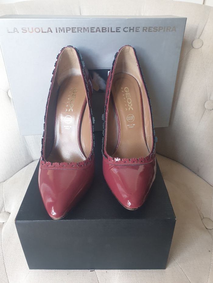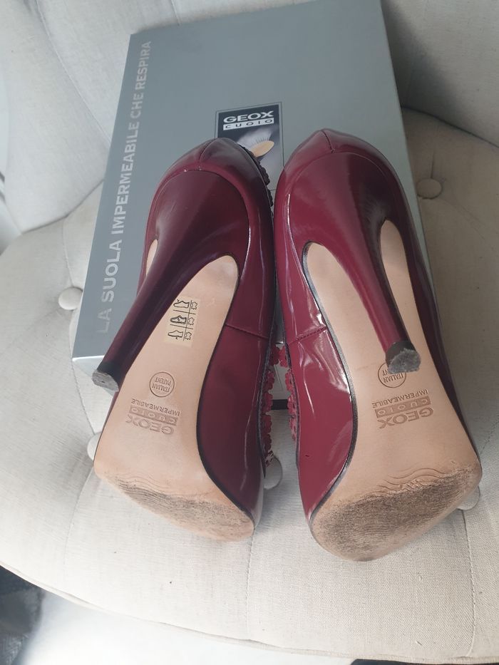 GEOX modèle Larisa - Escarpins en Cuir vernis rouge bordeaux (un rouge foncé, profond). Détail bords effet dentelle cuir. Talons de 10cm. Pointure : US10. [Ma pointure habituelle FR40]. Modèle porté quelques heures pour un mariage. Aucune marque d'usure. Mettre des patins neufs, pour avoir une semelle neuve.