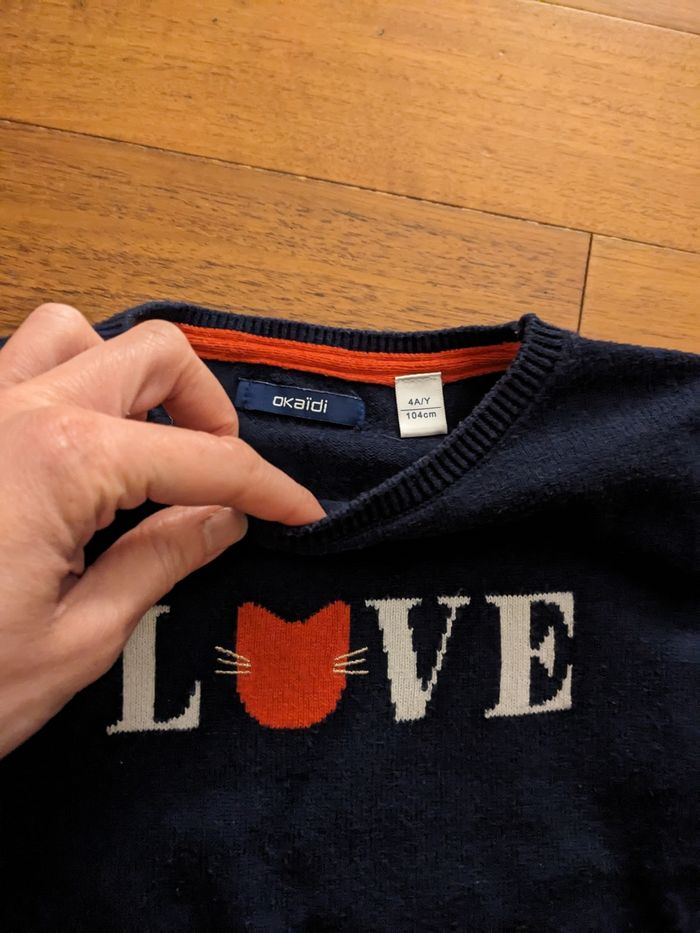 Joli pull bleu marine et motif love chat Ma fille l a adoré ! Okaidi 4 ans