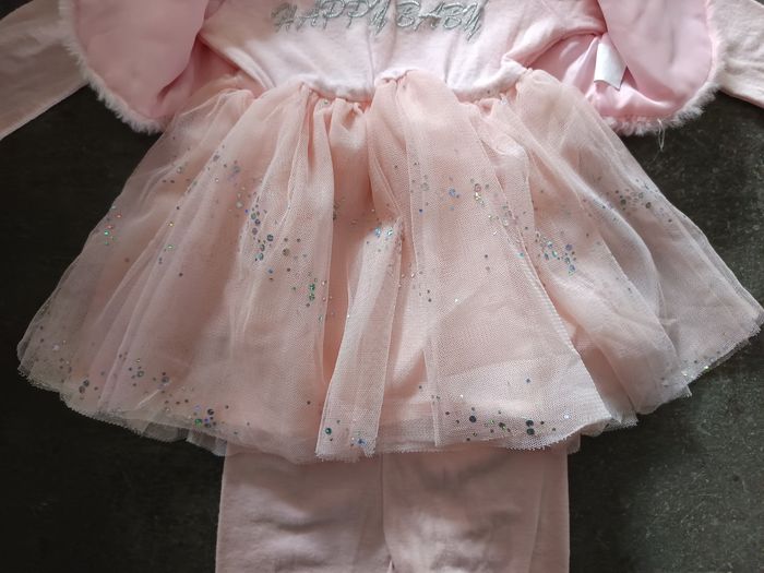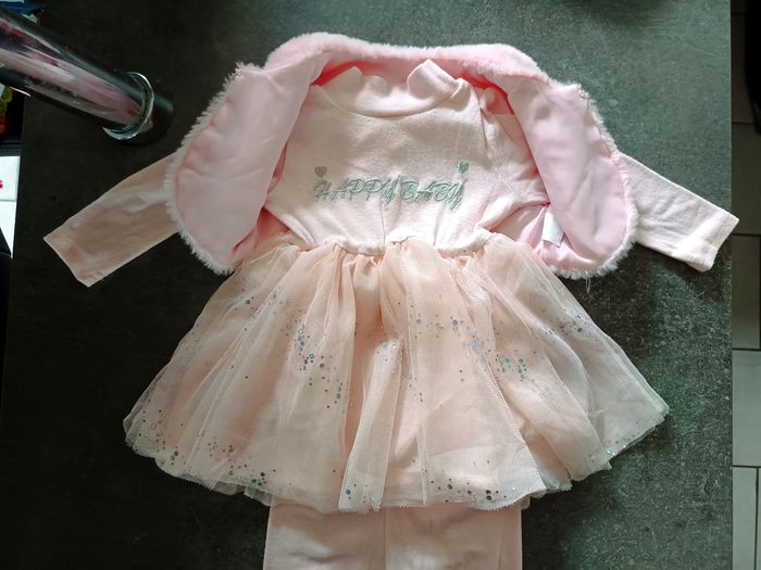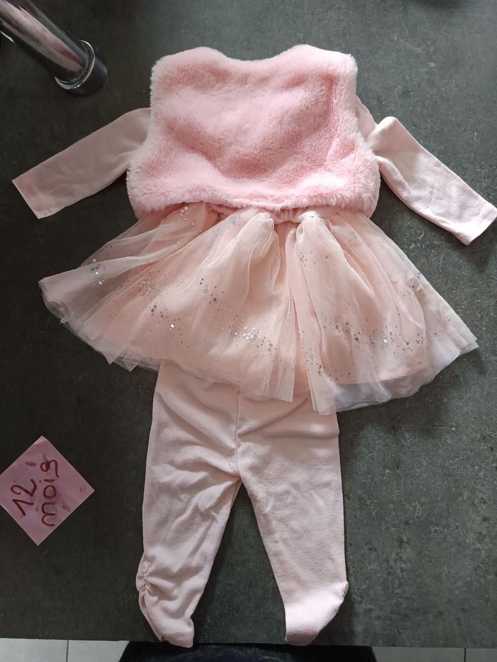 Ensemble 3 pièces : - 1 robe rose a tulle et strass avec inscription "Happy baby" - 1 legging rose - 1 gilet moumoute rose Très bon état Taille 12 mois